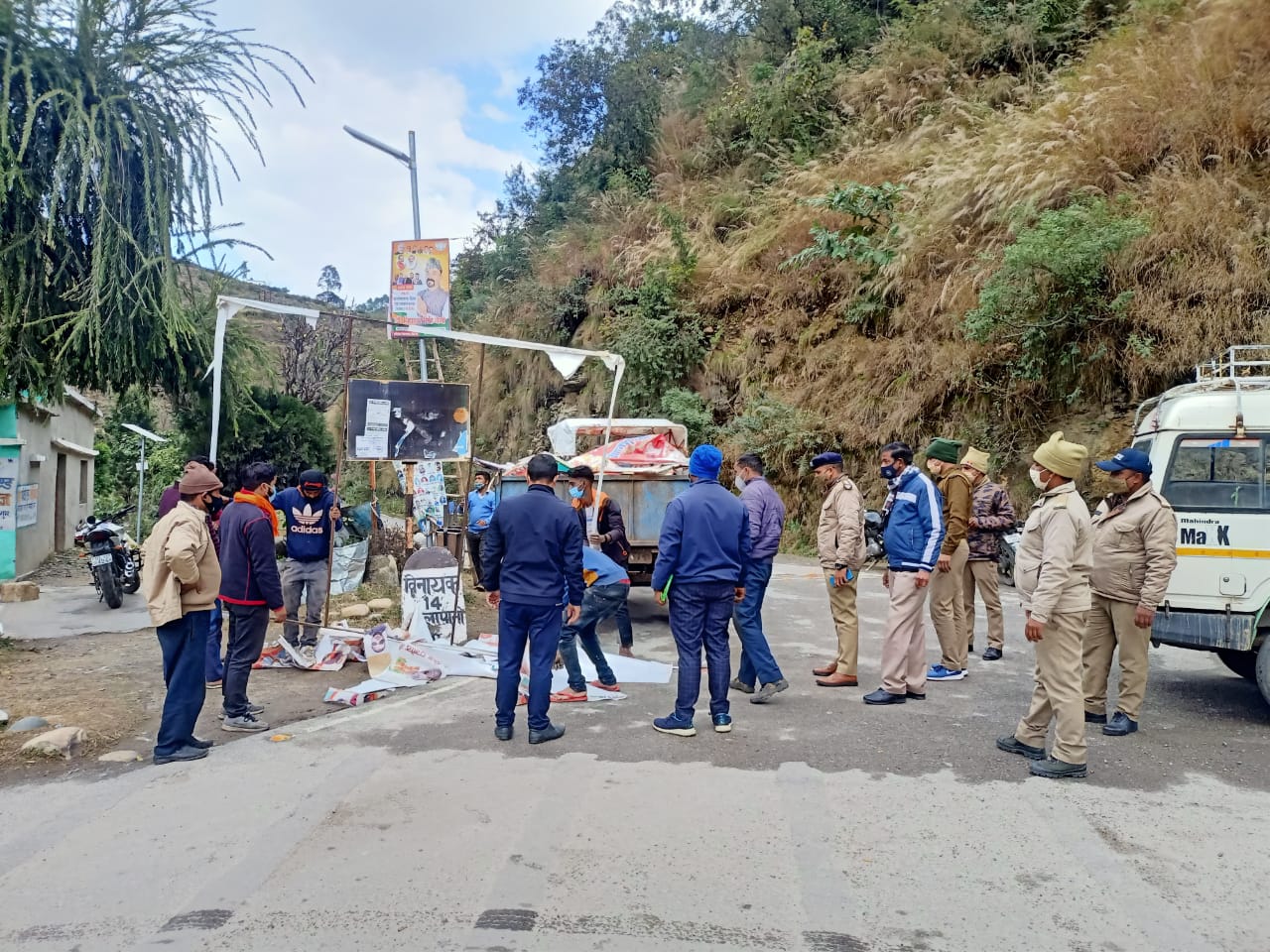 अल्मोड़ा-आज दिनांक 09.01. 2022 को एसएसपी अल्मोड़ा डॉ० मंजूनाथ टीसी द्वारा आचार संहिता के नियमो का पालन कराने हेतु समस्त प्रभारियों को दिए निर्देश के क्रम में कस्बा भिकियासैंण में थानाध्यक्ष भतरौजखान अनीश अहमद द्वारा नायब तहसीलदार दीवान गिरी,नगर पंचायत ई.ओ. अनिरुद्ध गौड़ व चौकी प्रभारी भिकियासैंण ओम प्रकाश नेगी के साथ संयुक्त अभियान चलाकर लोक संपत्ति पर लगे राजनीतिक दलों के प्रचार प्रसार सामग्री को हटाया गया।