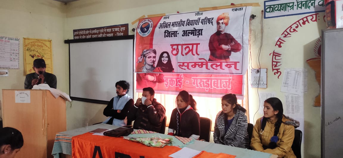 अल्मोड़ा-आज अखिल भारतीय विद्यार्थी परिषद अल्मोड़ा जिले का छात्रा सम्मेलन गरुड़बाज इकाई में सम्पन्न हुआ।कार्यक्रम का शुभारम्भ दीप प्रज्वलन के साथ विभाग संगठन मंत्री प्रशांत गौड़, प्रदेश S. F. D प्रमुख निर्मल सिंह तड़ागी,नगर छात्रा प्रमुख हेमा बिष्ट,नगर सह मंत्री रवीना आर्या, भगवती ने किया।कार्यक्रम में महिला सशक्तिकरण,वर्तमान में सामाजिक जीवन में छात्राओं की भूमिका,विद्यार्थी परिषद का इतिहास आदि विषयो पर चर्चा हुई।अखिल भारतीय विद्यार्थी परिषद अल्मोड़ा विभाग के विभाग संगठन मंत्री प्रशांत गौड़ ने छात्राओं क़ो सम्बोधित करते हुए कहा कि विद्यार्थी परिषद छात्र -छात्राओं क़ो उनके रूचि के अनुसार मंच उपलब्ध कराती है।विद्यार्थी परिषद ने प्रवाही समुदाय का स्थायी संगठन बनाकर स्थापित किया है।प्रान्त S. F. D प्रमुख निर्मल जी ने कहा की वर्तमान में पर्यावरण संरक्षण की जिम्मेदारी हमारी पहली प्राथमिकता है,साथ ही उन्होंने छात्र -छात्राओं से ज्यादा से ज्यादा वृक्ष लगाने के लिये आह्वाहन किया।जिला संयोजक कृष्णा नेगी ने इस उपलक्ष्य में कहा कि विद्यार्थी परिषद राष्ट्र के पुनर्निर्माण हेतु संकल्पबद्ध है।परिषद का प्रत्येक कार्यकर्ता ज्ञान,शील,एकता के ध्येय मन्त्र को लेकर हर वर्ग के छात्र छात्रा को संगठन से जोड़ने हेतु कार्य करें। समापन सत्र में प्रदेश कार्यकारिणी सदस्य भारतेन्दु कांडपाल ने कहा कि सिर्फ ख़ाना,कमाना,सोना ही जीवन नही है।कुछ समय देश,धर्म एवं राष्ट्र कार्य के लिये भी निकालना चाहिये।