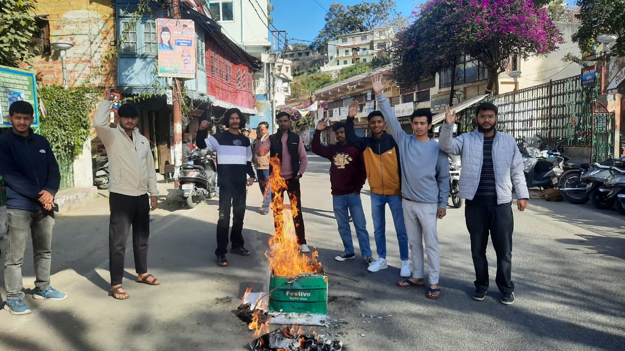 अल्मोड़ा-अल्मोड़ा परिसर के पूर्व छात्रसंघ अध्यक्ष द्वारा दुष्कर्म मामले में एबीवीपी मुखर हो गयी है। रविवार को एबीवीपी कार्यकर्ताओं ने दुष्कर्म के आरोप में फंसे पूर्व छात्र संघ अध्यक्ष का पुतला फूंका। इस दौरान उन्होंने आरोपी के खिलाफ सख्त कार्रवाई करने की मांग की। चौघानपाटा के पास एकत्रित हुए एबीवीपी के कार्यकर्ताओं ने नारेबाजी करते हुए पूर्व अध्यक्ष पंकज कार्की का पुतला फूंका। एबीवीपी कार्यकर्ताओं ने कहा कि पूर्व अध्यक्ष के इस कृत्य से समाज और कॉलेज शर्मशार हुआ है। नारी के साथ हुए अपमान को किसी भी हाल में बर्दाश्त नहीं किया जा सकता। उन्होंने कहा कि इस विपरीत स्थिति में एबीवीपी संगठन पीड़ित छात्रा के साथ खड़ा है। उन्होंने पुलिस, प्रशासन से आरोपी पूर्व अध्यक्ष के खिलाफ सख्त कार्रवाई की मांग की है। विदित हो कि पूर्व छात्र संघ अध्यक्ष पर कॉलेज की ही एक छात्रा ने दुष्कर्म का आरोप लगाया है। पुलिस ने आरोपी के खिलाफ मुकदमा दर्ज किया है। इस मौके पर एबीवीपी जिला संयोजक राहुल कुमार, नगर मंत्री नितिन पारछा, रोहित कुमल्टा, साहिल नेगी, तुषार जोशी, उदय पवार, लक्की, चंद्रशेखर आदि मौजूद रहे।
