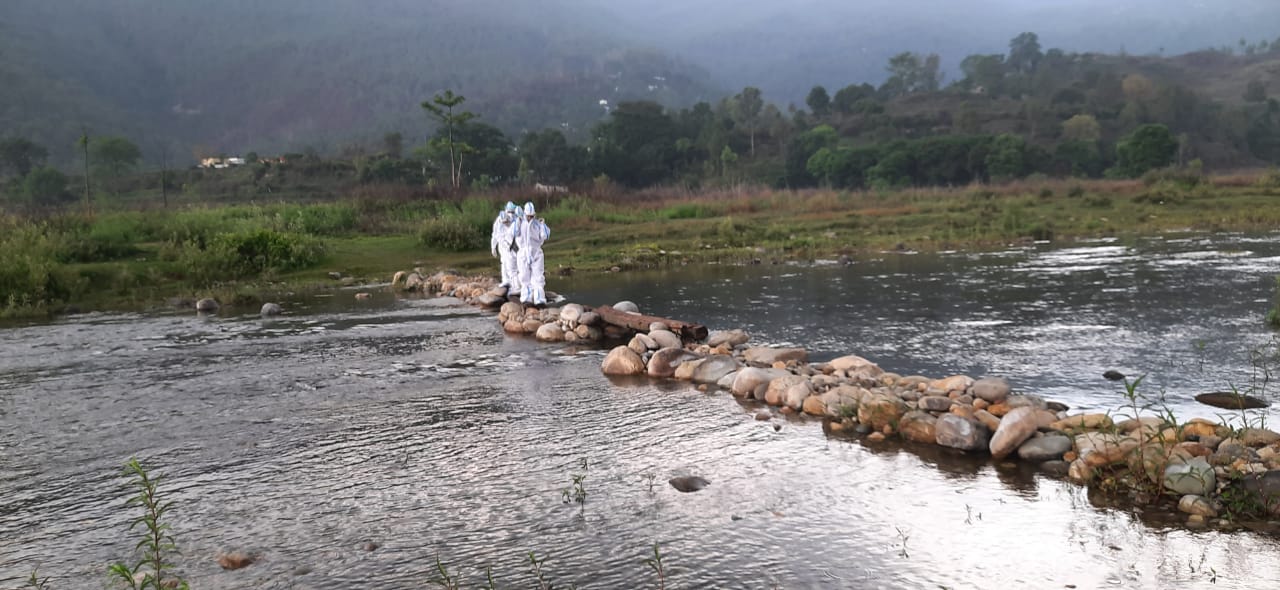 अल्मोड़ा-पंकज भट्ट वरिष्ठ पुलिस अधीक्षक अल्मोड़ा द्वारा कोरोना महामारी के दूसरी लहर में सभी थाना प्रभारियों को एक ओर नियमों का पालन न करने वालों के विरूद्व कार्यवाही के निर्देश,वहीं दूसरी ओर हर जरूरतमन्दों की मदद एवं कठिन परिस्थितियों में भी मानवता का फर्ज निभाने की प्रेरणा से प्रेरित हो कर अल्मोड़ा पुलिस लगातार मानवता का फर्ज निभा रही है।दिनाॅक 5 मई को चौखुटिया पुलिस को सूचना मिली कि भैल्ट गाॅव में एक अज्ञात वृद्व उम्र लगभग 50-55 वर्ष मूर्छित अवस्था में पड़ा है तथा कोरोना वायरस के संक्रमण के डर से गाॅव में दहशत का माहौल बना हुआ है कोई भी पास जाने को तैयार नहीं है।इस सूचना पर मासी चौकी प्रभारी उ०नि० सुनील धानिक अपनी टीम का० दीपक सक्टा,का० गुमेज एवं होमगार्ड पंकज गिरी एवम स्थानीय प्रताप सिंह भंडारी के साथ तुरन्त 10 किलोमीटर सड़क मार्ग एवं ढेड़ किलोमीटर लगभग पैदल व नदी के मार्ग को पार कर पहॅुचे।मामले की संवेदनशीलता को समझते हुए पीपीई किट पहनकर तथा कोरोना उपबन्धों का पालन करते हुए दुर्गम स्थान से पैदल व नदी पार कर मूर्छित व्यक्ति को कंधे में लेकर सड़क तक लेकर चौखुटिया अस्पताल पहॅुचाया।