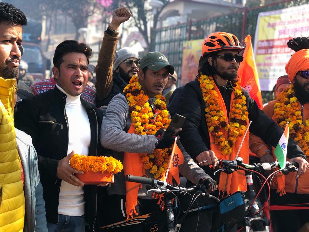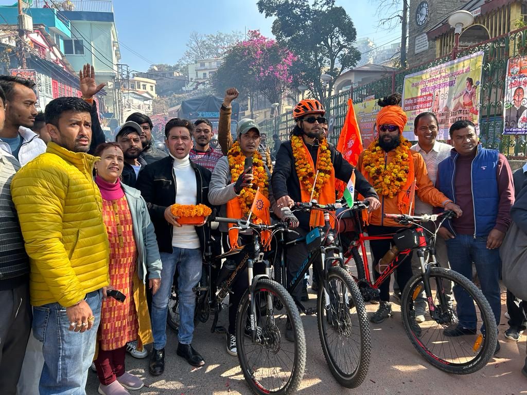 अल्मोड़ा-आज दिनांक 10 जनवरी को अल्मोड़ा के तीन युवा साइकिलिस्ट मोहन सिंह भंडारी,राहुल साह, मनोज सिंह राणा साइकिल द्वारा 22 जनवरी को होने जा रहे राम मंदिर प्राण प्रतिष्ठा में साइकिल के माध्यम से अयोध्या को प्रस्थान के लिए निकले।उनके अयोध्या प्रस्थान में नगर वासियों को बहुत उत्साह देखने को मिला और चौघानपाटा में उनके अयोध्या प्रस्थान के कार्यक्रम में नगर वासियों द्वारा माल्यार्पण मिष्ठान वितरण एवं भव्य आतिशबाजी का आयोजन किया गया।तीनों साइकिलिस्ट युवाओं में गजब का उत्साह रहा।उनका उद्देश्य सनातन धर्म का प्रचार करना एवं इस साइकिल यात्रा के माध्यम से युवाओं को नशे से दूर रहकर अपने स्वास्थ्य के प्रति सचेत रहने का भी एक संदेश उनके द्वारा दिया जा रहा है एवं अल्मोड़ा नगर का प्रतिनिधित्व साइकिल द्वारा अयोध्या में श्री राम के चरणों में पहुंचना रहा।आज के इस कार्यक्रम में पूर्व दर्जा राज्य मंत्री गोविंद पिलख्वाल,जिला महामंत्री धर्मेंद्र बिष्ट, व्यापार मंडल जिला अध्यक्ष सुशील साह,जिला महामंत्री भैरव गोस्वामी, व्यापार मंडल संगठन महामंत्री मनीष जोशी, किशन लाल, राजू तिवारी, विनीत बिष्ट ,परितोष जोशी ,भाजपा नगर अध्यक्ष अमित साह मोनू,अजय वर्मा,सूरज वाणी, भाजपा नगर महामंत्री अर्जुन बिष्ट ,अशोक गोस्वामी, दिनेश मटपाल ,चन्द्रा जोशी, आशीष कुमार ,आनंद कनवाल, संजय वर्मा टैनी ,भारत साह ,पंकज बिष्ट ,प्रतेश पाण्डेय, आनंद भोज ,सोनी गोस्वामी, अतुल पाण्डेय, अभिषेक जोशी, राहुल गोस्वामी ,हंसा दत्त तिवारी, गौरव कुमार ,मोहित बिष्ट ,सचिन राणा, गणेश बगड़वाल, रोहित भोज आदि लोग रहे।