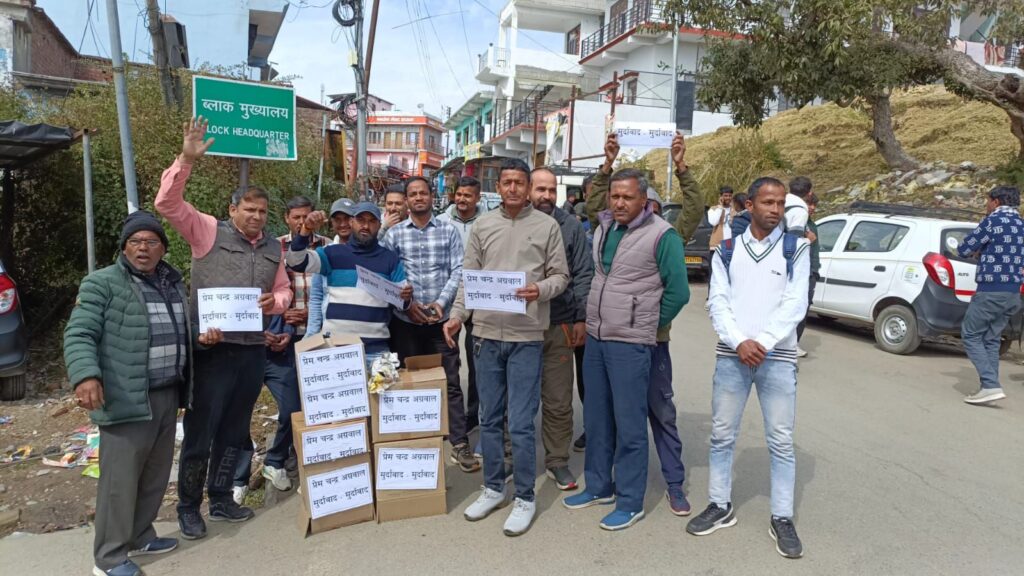 अल्मोड़ा-पहाड़ के लोगों पर दिए गए बयान को लेकर कांग्रेस पार्टी जिलाध्यक्ष भूपेंद्र सिंह भोज के नेतृत्व में कांग्रेसजनों ने आज जीआईसी से चौघानपाटा तक वित्त मंत्री प्रेम चंद्र अग्रवाल की सांकेतिक शवयात्रा निकाल कर चौघानपाटा पर आकर शवदाह किया।कांग्रेस जिलाध्यक्ष भूपेंद्र सिंह भोज ने कहा कि उत्तराखंड के पहाड़ियों को साले पहाड़ी कहकर उत्तराखंड के वित्त मंत्री ने अपना मानसिक संतुलन खो जाने के संकेत दिए हैं।उत्तराखंड राज्य निर्माण में पहाड़ के लोगों का योगदान कोई नहीं भूल सकता,पहाड़ के लोगों को गाली देना राज्य के तमाम आंदोलनकारियों का अपमान है।पहाड़ के लोग इस अपमान का बदला जरूर लेंगे।जिलाध्यक्ष भूपेंद्र सिंह भोज ने खुली चुनौती देते हुए कहा कि भाजपा के मंत्री में अगर हिम्मत है तो वे पहाड़ का दौरा कर के दिखाए। कांग्रेस पार्टी उन्हें अल्मोड़ा जिले की सीमाओं में घुसने नहीं देगी।ऐसे पहाड़विरोधी नेताओं के लिए उत्तराखंड में कोई जगह नहीं होनी चाहिए।मुख्यमंत्री को अपने इस पहाड़ विरोधी मंत्री का तुरंत इस्तीफा लेना चाहिए।शवदाह कार्यक्रम में कांग्रेस जिलाध्यक्ष भूपेंद्र सिंह भोज, नगर अध्यक्ष कांग्रेस तारा चंद्र जोशी, महिला जिलाध्यक्ष राधा बिष्ट,प्रदेश सेवादल महिला अध्यक्ष शोभा जोशी, पूर्व नगर अध्यक्ष पूरन रौतेला,युवा कांग्रेस जिलाध्यक्ष दीपक कुमार, एनएसयूआई जिलाध्यक्ष संजू सिंह, युवा कांग्रेस नगर अध्यक्ष जगदीश तिवारी,सोमेश्वर ब्लॉक अध्यक्ष कुंदन भंडारी,सैनिक प्रकोष्ठ जिलाध्यक्ष राजू भट्ट,पूर्व छात्रसंघ अध्यक्ष पंकज कार्की,दीप सिंह डांगी,विनोद वैष्णव, लीला जोशी,निजाम कुरैशी,सुशील साह,कार्तिक साह,किरण आर्य,मंजू काण्डपाल,फेमिना खान,इरशाद एहमद,महेश आर्य,बाल विक्रम सिंह रावत,गौरव सतवाल,प्रदीप बिष्ट,अमर बिष्ट,एन डी पांडेय,गौरव वर्मा,वैभव पाण्डेय,मोहन सिंह देवली,हरेंद्र सिंह रावत,धीरेन्द्र सिंह गैलाकोटी,जगदीश पांडे,संजीव कर्मियाल,उमेश गुरुरानी,विश्वास टम्टा,शिवम पंत, कमल मेहता,नितिन रावत,देवेन्द्र कनवाल,रोहित रौतेला,आशुतोष गोस्वामी,सोनी गोस्वामी,देव सिंह कनवाल,मनोज बिष्ट आदि मौजूद रहे।