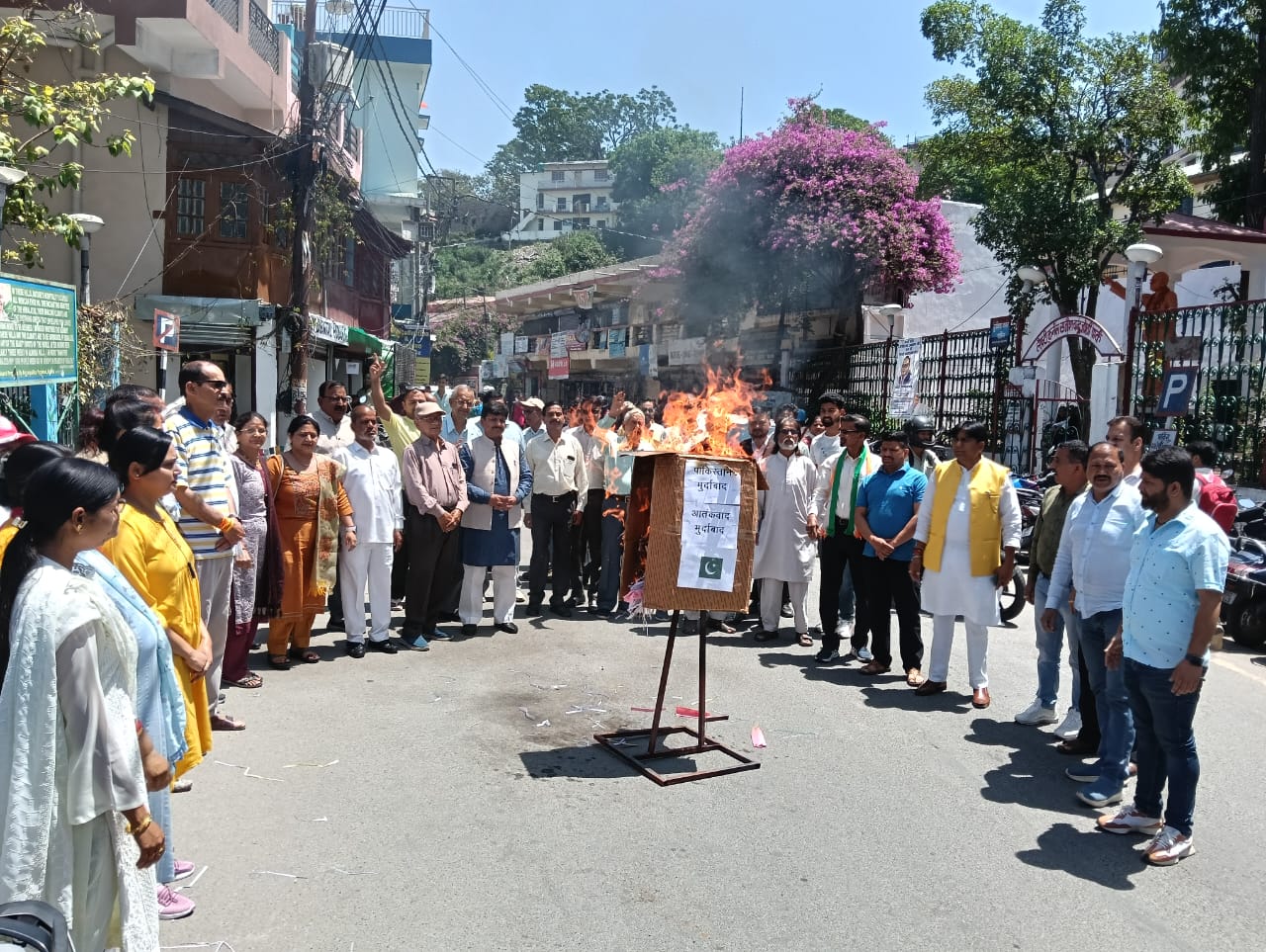 अल्मोड़ा-जम्मू कश्मीर के पहलगाम में घूमने आए सैलानियों पर पाक प्रायोजित आतंकी हमले को लेकर कांग्रेस कार्यकर्ताओं ने पाकिस्तान और आतंकवाद का पुतला दहन किया।साथ ही हमले में मृत लोगों के प्रति संवेदना प्रकट करते हुए मौन रखा।कांग्रेस कार्यकर्ताओं ने पाकिस्तान मुर्दाबाद,आतंक के आगे नहीं झुकेंगे जैसे नारों के साथ जमकर प्रदर्शन किया।जिलाध्यक्ष भूपेंद्र सिंह भोज ने कहा कि कश्मीर में भारतीय नागरिकों सैलानियों पर हुए हमले से पाकिस्तान का आतंक पोषित चेहरा एक बार फिर से सबके सामने आया है,आतंकवाद के सामने देश का कोई नागरिक नहीं झुकेगा,पूरा देश एकजुट है और आतंकियों के खिलाफ मजबूत होकर खड़ा है।उन्होंने इस कायरतापूर्ण हमले में मारे गए लोगों के परिवारों के प्रति अपनी संवेदना व्यक्त करते हुए कहा कि पूरा देश इन परिवारों के साथ खड़ा है जो आज आतंकवाद का शिकार हुए हैं।उन्होंने कहा कि पाक प्रायोजित आतंकी कायर है,उनका हश्र भी बुरा ही होगा, भारतीय सेना इन आतंकियों को जल्दी खत्म कर देगी।पुतला दहन और श्रद्धांजलि सभा में कांग्रेस जिलाध्यक्ष भूपेंद्र सिंह भोज,विधायक मनोज तिवारी,पूर्व नगर पालिका अध्य्क्ष प्रकाश जोशी,नगर अध्य्क्ष तारा चंद्र जोशी,महिला जिलाध्यक्ष राधा बिष्ट, युवा जिलाध्यक्ष दीपक कुमार,जिला उपाध्यक्ष विनोद वैष्णव,अमरजीत भाकुनी,आनंद सिंह बिष्ट,जिला महामंत्री दिनेश पिल्खवाल,गीता मेहरा,परितोष जोशी,निर्मल रावत, महेश आर्य,गोविन्द मेहरा,पूरन रौतेला वैभव पाण्डेय,एन डी पाण्डेय,आनंद सिंह बगड़वाल,दीप डांगी,सुशील साह,पुष्पा पाण्डेय,भैरव गोस्वामी, हरीश चुपडाल,निज़ाम कुरैसी,दानिश खान,गुंजन चमयाल,रविंद्र टम्टा, गौरव वर्मा,किरण आर्य,मोहन देवली, फेमिना खान,नज़मा परवीन,अरुण तिवारी,तारा तिवारी,मंजू कांडपाल, संजीव कार्मियाल,उमेश गुरूरानी, देव सिंह कनवाल,भूपाल सिंह रावत, शुभाशु रौतेला,रोहित रौतेला,कार्तिक साह,जया जोशी,पवन मेहरा,अमित बिष्ट,राजेंद्र बिष्ट,तारा चंद्र साह,हेम तिवारी,मोहमद हारिश,पारस लोहनी सहित दर्जनों कांग्रेस कार्यकर्ता मौजूद रहे।