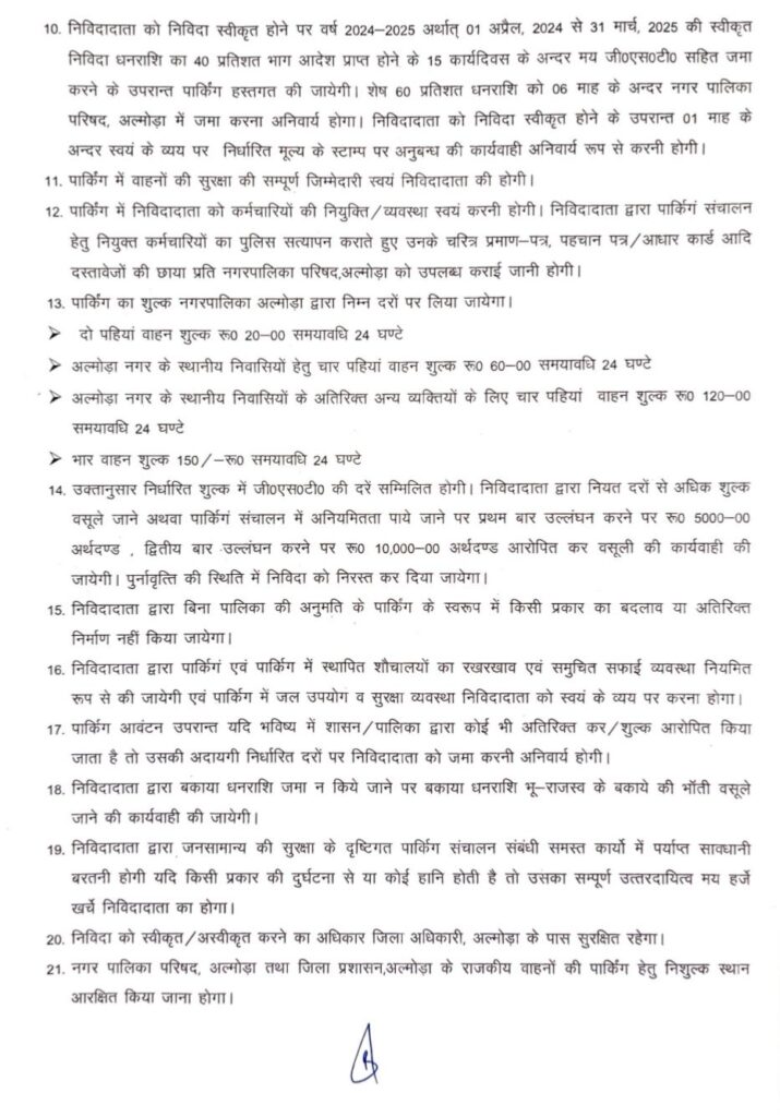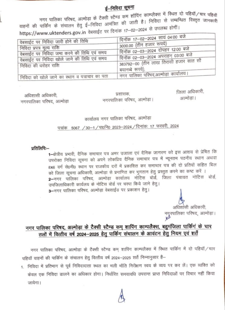 अल्मोड़ा-नगर पालिका की ओर से टैक्सी स्टैंड कम शॉपिंग काम्प्लेक्स की पार्किंग को लेकर पालिका ने टेंडर प्रक्रिया शुरू कर दी है।पार्किंग के एक वर्ष के ठेके के लिए 38,37,926 रूपये न्यूनतम धनराशि तय की गई है। टेंडर जमा करने की अंतिम तिथि 2 मार्च है और उसी दिन टेंडर खोले जाएंगे।निविदा से सम्बंधित अधिक जानकारी uktenders.gov.in पर जाकर देख सकते हैं।