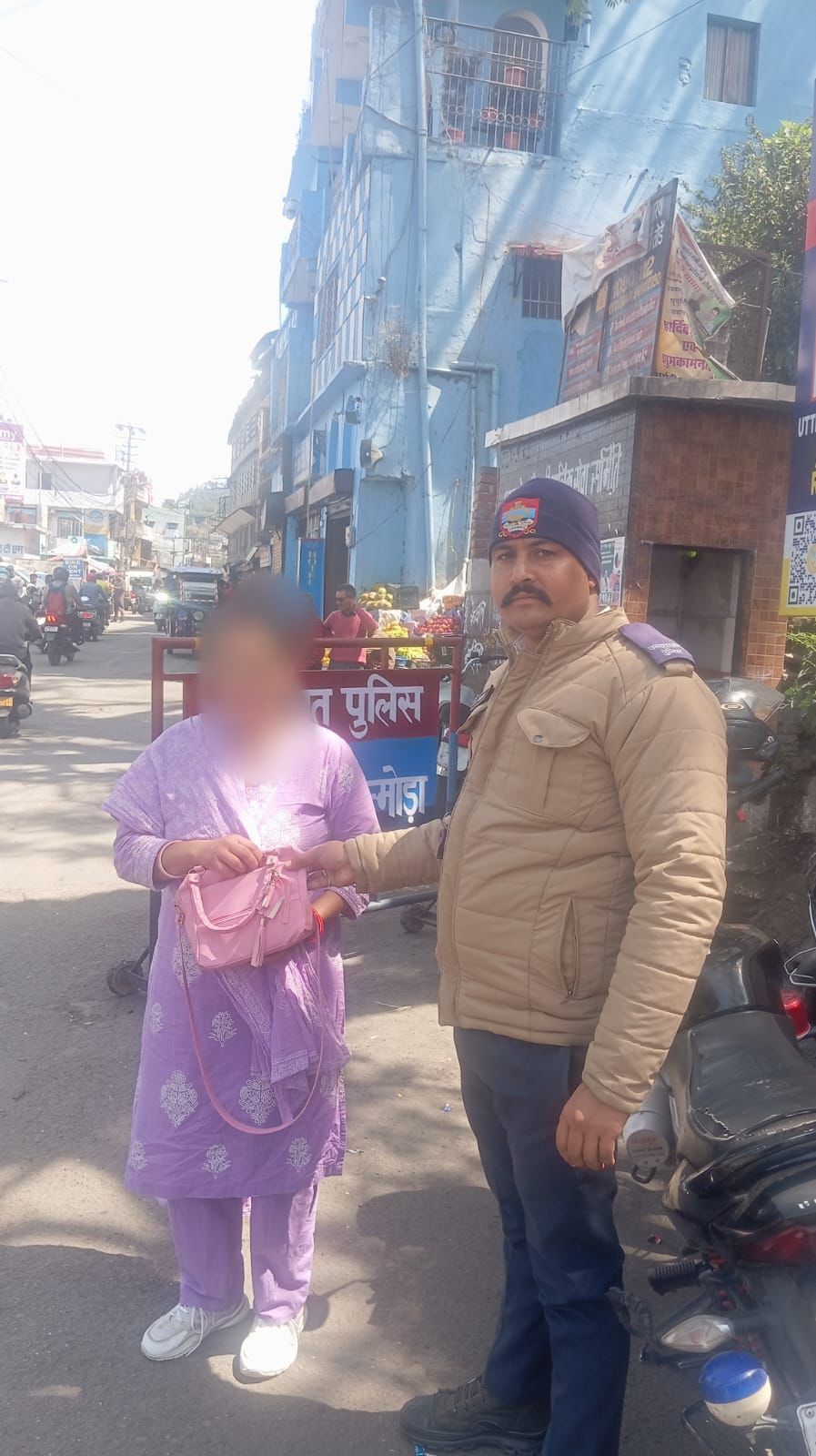 अल्मोड़ा- दिनांक 7 अप्रैल को ट्रैफिक पुलिस में तैनात कांस्टेबल हेमंत सिंह को टैक्सी स्टैंड पर एक पर्स मिला,जिसमें नगदी एवं आवश्यक दस्तावेज थे। कांस्टेबल हेमंत सिंह द्वारा पर्स में मिले दस्तावेजों के आधार पर पर्स स्वामिनी की जानकारी जुटाई गई तथा अथक प्रयासों के बाद पर्स को सुरक्षित रूप से उसकी स्वामिनी के सुपुर्द किया गया।पर्स वापस मिलने पर स्वामिनी ने अल्मोड़ा ट्रैफिक पुलिस के जवान की ईमानदारी की सराहना करते हुए आभार व्यक्त किया।