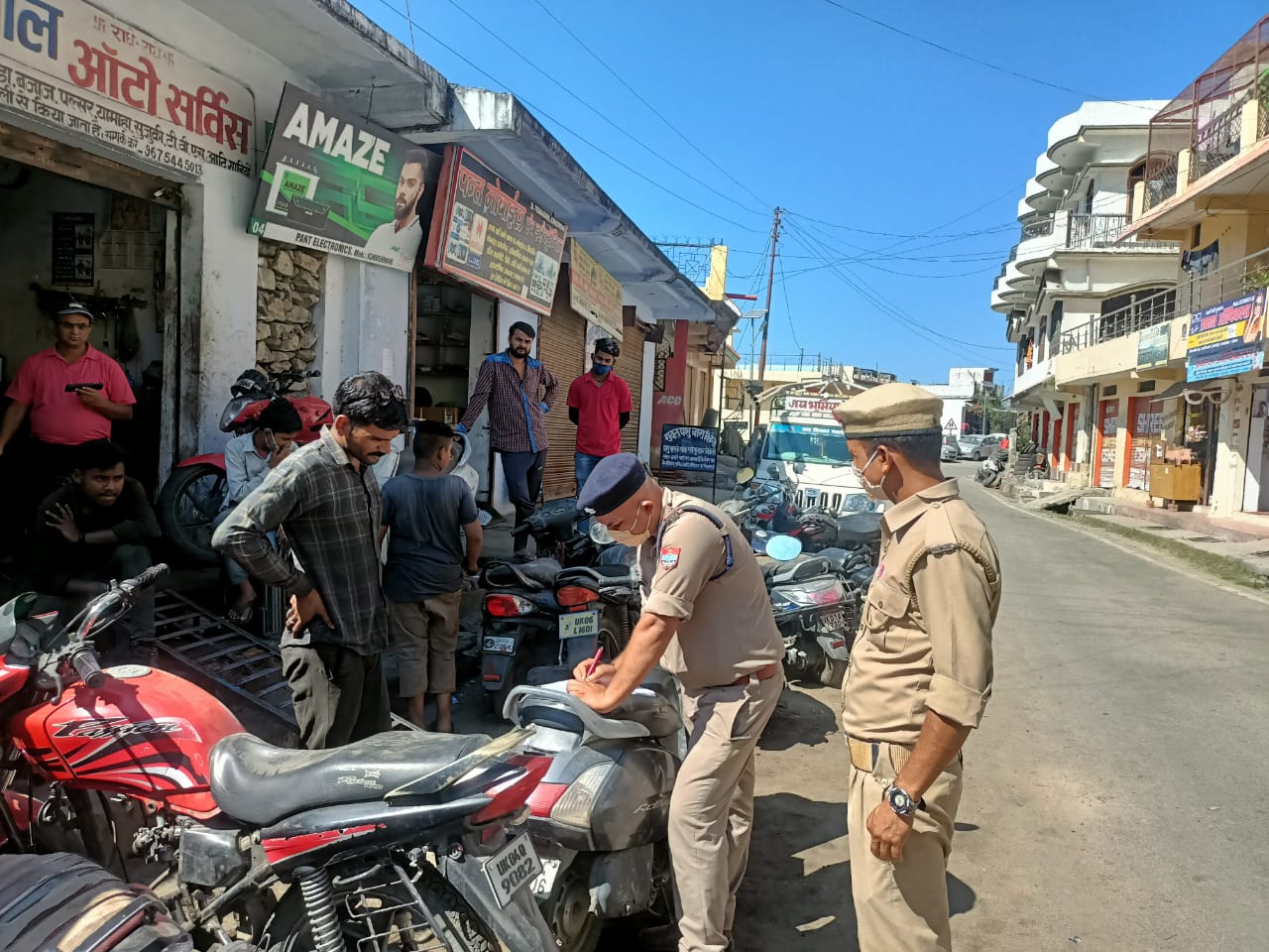 अल्मोड़ा-अवरोध रहित सुगम यातायात अभियान के अन्तर्गत एस०एस०पी० अल्मोड़ा पंकज भट्ट के निर्देश पर जनपद में लगातार अभियान के अन्तर्गत आज दिनॉक 14.10.2021 थानाध्यक्ष चौखुटिया दिनेश नाथ महन्त द्वारा पुलिस टीम के साथ स्थानीय बाजार में सड़क पर वाहन खड़ा कर जाम लगाने वाले वाहनों में जैमर लगाकर 10 वाहन चालकों के विरूद्व उत्तराखण्ड पुलिस अधिनियम के अन्तर्गत कार्यवाही करते हुए 5000रु जुर्माना जमा करवाया गया।कोतवाली रानीखेत के उ०नि0० निखिलेश सिंह विष्ट द्वारा पुलिस टीम के साथ सुभाष चौक रानीखेत में अनधिकृत रुप से खड़े वाहनों को हटाते हुए सड़क किनारे अतिक्रमण कर यातायात बाधित करने पर 2 व्यक्तियों का चालान एवं 09 लोगों को नोटिस दी गयी।जिससे यातायात में बाधित ना हो।थाना भतरौंजखान के उ०नि० ललित सिंह दिगारी द्वारा कस्बा भतरौंजखान में सड़क पर निर्माण सामग्री डालने वाले व्यक्तियों को चिन्हित कर कार्यवाही करते हुए टैक्सी चालकों से निर्धारित स्थानों पर वाहनों को खड़ा करने की अपील की गयी।थानाध्यक्ष सल्ट सुशील कुमार द्वारा कस्बा शशिखाल में स्थानीय लोगों को यातायात नियमों का पालन करने की अपील करते हुए, अनियंत्रित खड़े वाहनों को वन साईड लेन में लगवाया गया।