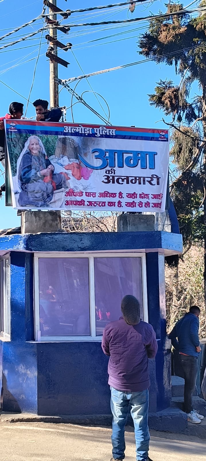 अल्मोड़ा-प्रदीप कुमार राय एसएसपी अल्मोड़ा द्वारा अपनी धर्मपत्नी श्रीमती रितु राय के साथ आज दिनांक 14.12.2022 को अल्मोड़ा नगर के टैक्सी स्टैण्ड तिराहे पर बने पुलिस सहायता केन्द्र पर जरुरतमंद/बेसहारा लोगों के लिए नई पहल आमा की अलमारी खोलकर शुभांरभ किया गया।एसएसपी अल्मोड़ा की इस नेक पहल का मुख्य उद्देश्य जरुरतमंद/बेसहारा लोगों को कड़ाके की ठण्ड से बचाने व उनके जीवन स्तर में सुधार लाने के लिए कपड़े/कम्बल इत्यादि उपलब्ध कराकर उनकी सहायता करना है।आमा की अलमारी खुलते ही एसएसपी अल्मोड़ा सहित दानदाताओं द्वारा बच्चों से लेकर के बुजुर्गों तक के कपड़े दान किये गये।जनता,व्यापार मण्डल,टैक्सी यूनियन,वरिष्ठ नागरिकों द्वारा कपड़े दान करके अपना सहयोग दिया जा रहा है।स्थानीय लोगों,व्यापार मण्डल,टैक्सी यूनियन,वरिष्ठ नागरिकों ने एसएसपी अल्मोड़ा द्वारा जरुरतमंद/बेसहारा लोगों के लिए उठाये गये इस नेक कदम आमा की अलमारी की सराहना करते हुए कहा कि इससे इन लोगों की जीवन शैली में भी काफी सुधार आएगा।इस पहल से समाज के अन्य लोगों को भी जनहित में ऐसे कार्य करने की प्रेरणा मिलेगी।