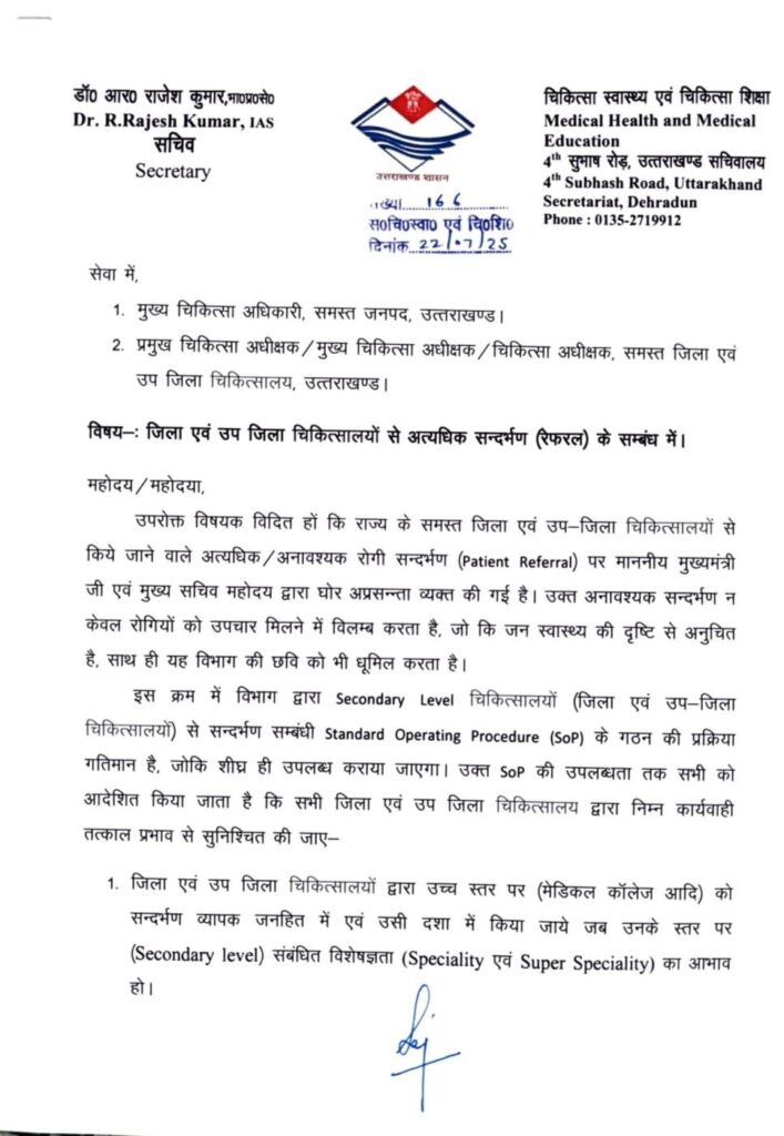 देहरादून-मुख्यमंत्री पुष्कर सिंह धामी के निर्देश पर उत्तराखंड शासन ने सरकारी अस्पतालों में मरीजों के अनावश्यक रेफरल पर सख्ती बरतनी शुरू कर दी है। स्वास्थ्य सचिव डॉ. आर. राजेश कुमार ने स्पष्ट किया है कि अब बिना ठोस चिकित्सकीय कारण के किसी भी रोगी को जिला और उप-जिला अस्पतालों से उच्च संस्थानों जैसे मेडिकल कॉलेजों या बड़े अस्पतालों को रेफर नहीं किया जाएगा। स्वास्थ्य सचिव ने बताया कि मुख्यमंत्री जी के निर्देशों के क्रम में यह सुनिश्चित किया जा रहा है कि प्रत्येक मरीज को प्राथमिक उपचार और विशेषज्ञ राय जिला स्तर पर ही मिले। अनावश्यक रेफरल से न केवल संसाधनों पर दबाव बढ़ता है बल्कि मरीज को समय पर समुचित इलाज नहीं मिल पाता।