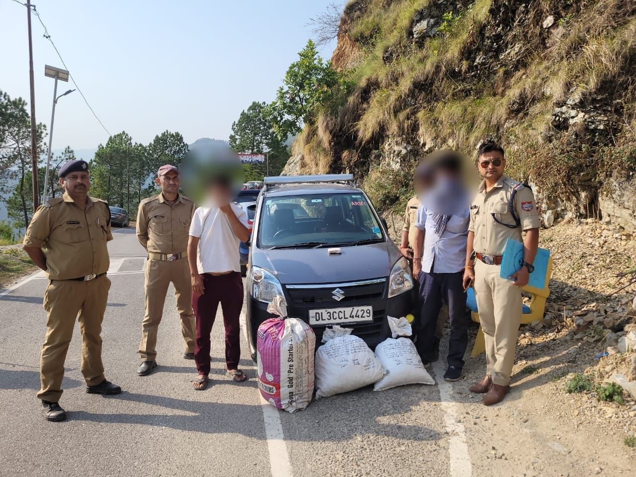 अल्मोड़ा-प्रदीप कुमार राय एसएसपी अल्मोड़ा द्वारा एस०ओ०जी० टीम एवम समस्त थाना/चौकी प्रभारियों को अवैध मादक पदार्थों की तस्करी, अवैध शराब की बिक्री एवं तस्करी पर अंकुश लगाये जाने हेतु सघन चैकिंग अभियान चलाकर कार्यवाही करने के निर्देश पर जनपद पुलिस द्वारा लगातार कार्यवाही की जा रही है।दिनांक 05/06/2022 को देवेन्द्र सिह राणा थानाध्यक्ष सल्ट मय पुलिस टीम के द्वारा थाना सल्ट के गेट के पास वाहन चैकिंग दौरान वैगनार कार नं० DL3CCL-4429 को रोककर चैक किया गया तो कार में 2 व्यक्ति सवार थे जिनके पास से 3 प्लास्टिक के कट्टो में कुल 23.400KG अवैध गाँजा कीमत- 3,51,000/-रु० बरामद करते हुए आरोपियों गिरफ्तार कर वाहन सीज किया गया।थाना सल्ट में धारा 8/20/60 एनडीपीएस एक्ट अभियोग पंजीकृत कर आवश्यक कार्यवाही की गई।देवेन्द्र सिह राणा थानाध्यक्ष सल्ट ने बताया कि आरोपियों से पूछताछ करने पर बताया कि यह गांजा उनके द्वारा जंगल व खेतो से स्वयं इकट्ठा कर अधिक दामो मे बेंचने के लिए दिल्ली व रामनगर ले जा रहे थे।आरोपी देवेन्द्र सिह रावत ड्राईवर है जो सराईखेत दिल्ली गाड़ी चलाता है तथा आरोपी पंकज सिह नेगी का दिल्ली मे भी घर है जो दिल्ली मे प्राईवेट नौकरी करता है।नशे के तस्करों की गिरफ्तारी किए जाने पर एसएसपी अल्मोड़ा ने पुलिस टीम को ढाई हजार रुपए नगद इनाम से पुरस्कृत किया है।गिरफ्तार व्यक्तियों की पहचान पंकज सिह नेगी उम्र 29 वर्ष पुत्र आलम सिह नेगी निवासी ग्राम- भंगलवाड़ी पो० कुलान्टेश्वर थाना सल्ट जिला अल्मोड़ा हाल- E-151/7 विश्वकर्मा कालोनी बदरपुर दक्षिण दिल्ली नई दिल्ली तथा देवेन्द्र सिह रावत उम्र 42 वर्ष पुत्र श्री गोविन्द सिह रावत निवासी ग्राम मटखानी पो० कुलान्टेश्वर थाना सल्ट जिला अल्मोड़ा के रूप में हुई है।पुलिस टीम में देवेन्द्र सिह राणा थानाध्यक्ष सल्ट,कानि० संजू कुमार थाना सल्ट,कानि०मौ० मंसूर थाना सल्ट,हो०गा०श्याम सिह थाना सल्ट शामिल रहे।