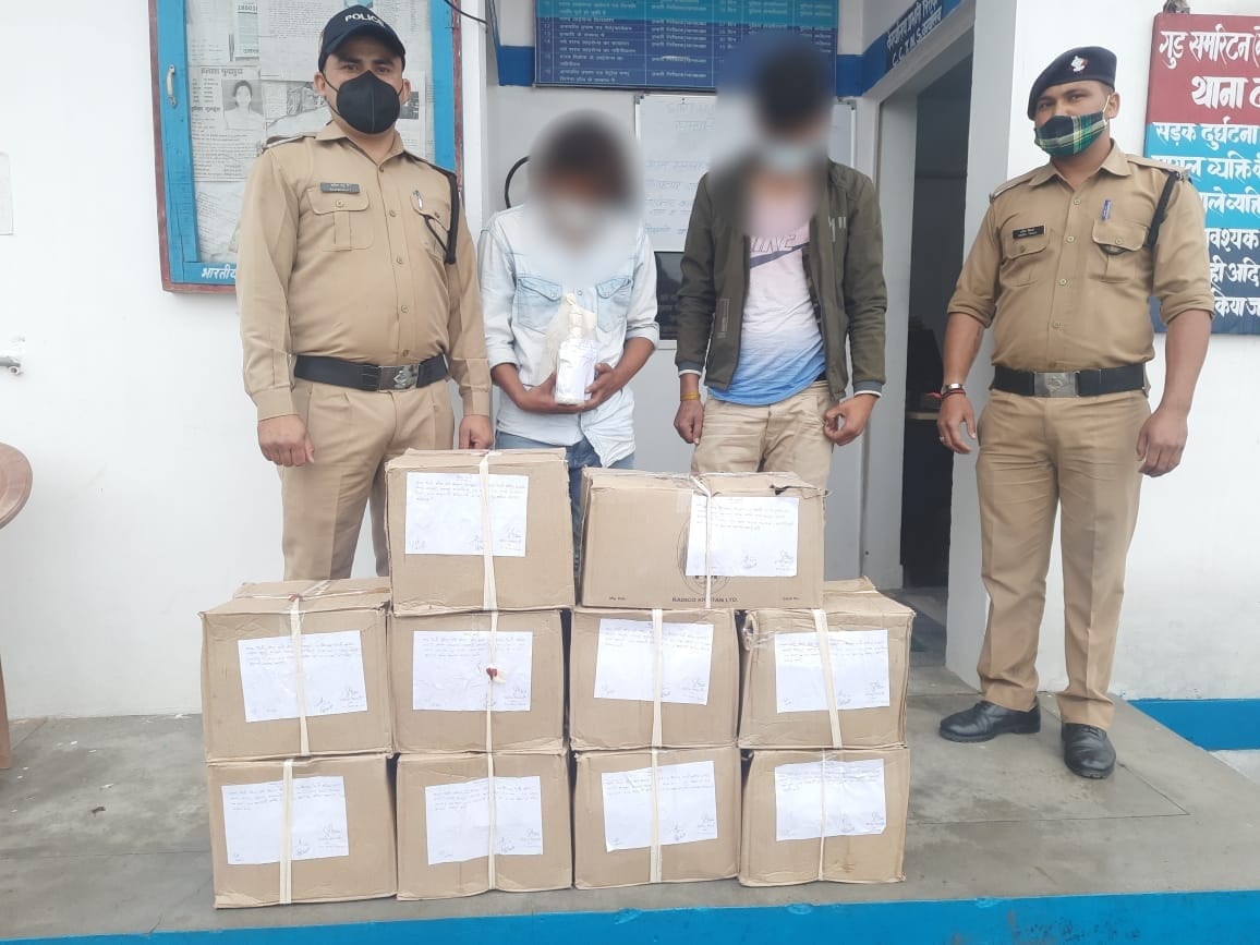 अल्मोड़ा-पंकज भट्ट वरिष्ठ पुलिस अधीक्षक अल्मोड़ा द्वारा कोविड कर्फ्यू के दौरान दौरान मादक पदार्थों की तस्करी करने वालों पर सर्तक दृष्टि रखते हुए लगातार कड़ी कार्यवाही करवाई जा रही है।इसी क्रम में 11.06.2021 की रात्रि दन्या पुलिस ने धौलादेवी में चेकिंग के दौरान वाहन बोलेरो UK-01TA-1940 को चैक किए जाने पर दो युवकों के कब्जे से 10 पेटी अवैध देशी एवं अंग्रेजी शराब बरामद कर दोनों को गिरफ्तार किया है।थानाध्यक्ष दन्या श्री संतोष देवरानी ने बताया कि धौलादेवी के पास पुलिस टीम द्वारा चेकिंग की जा रही थी जिस पर बोलेरो को चैक किए जाने में दो युवक जिसमें से एक टैक्सी चालक तथा दूसरा पनवा नौला में शराब भट्टी में सेल्समैन का कार्य करता है दोनों के कब्जे से अवैध शराब बरामद हुई पूछताछ पर बताया कि कोविड-कर्फ्यू के दौरान दुकानों के बंद होने पर अधिक लाभ प्राप्त करने के लिए शराब अपने गांव / क्षेत्र में बेचने हेतु ला रहे थे।चेकिंग के दौरान गिरफ्तार कर थाना दन्या में धारा-60/72 आबकारी अधिनियम,51 बी आपदा प्रबन्धन अधिनियम,2/3 महामारी अधिनियम,188 भा०द०वि० का अभियोग पंजीकृत कर आवश्यक वैधानिक कार्यवाही की जा रही है। वाहन सीज किया गया है।अभियुक्तों की पहचान कमल सिंह उम्र 21 वर्ष पुत्र त्रिलोक सिंह ग्राम मलाड पोस्ट धूरा,दन्या (टैक्सी चालक),बालम सिंह उम्र 23 वर्ष पुत्र खीम सिंह निवासी ग्राम मलाड़ पोस्ट धूरा दन्या ( सेल्स मैन) के रूप में हुई है।बरामदगी में 9 पेटी देशी/01 पेटी अंग्रेजी शराब (कुल 10 पेटी अवैध शराब) बरामद हुई है जिसकी कीमत 43,560 रुपये है।पुलिस टीम में थानाध्यक्ष दन्या संतोष देवरानी,उ०नि० इंदर ढैला,का०राजेश भट्ट शामिल रहे।