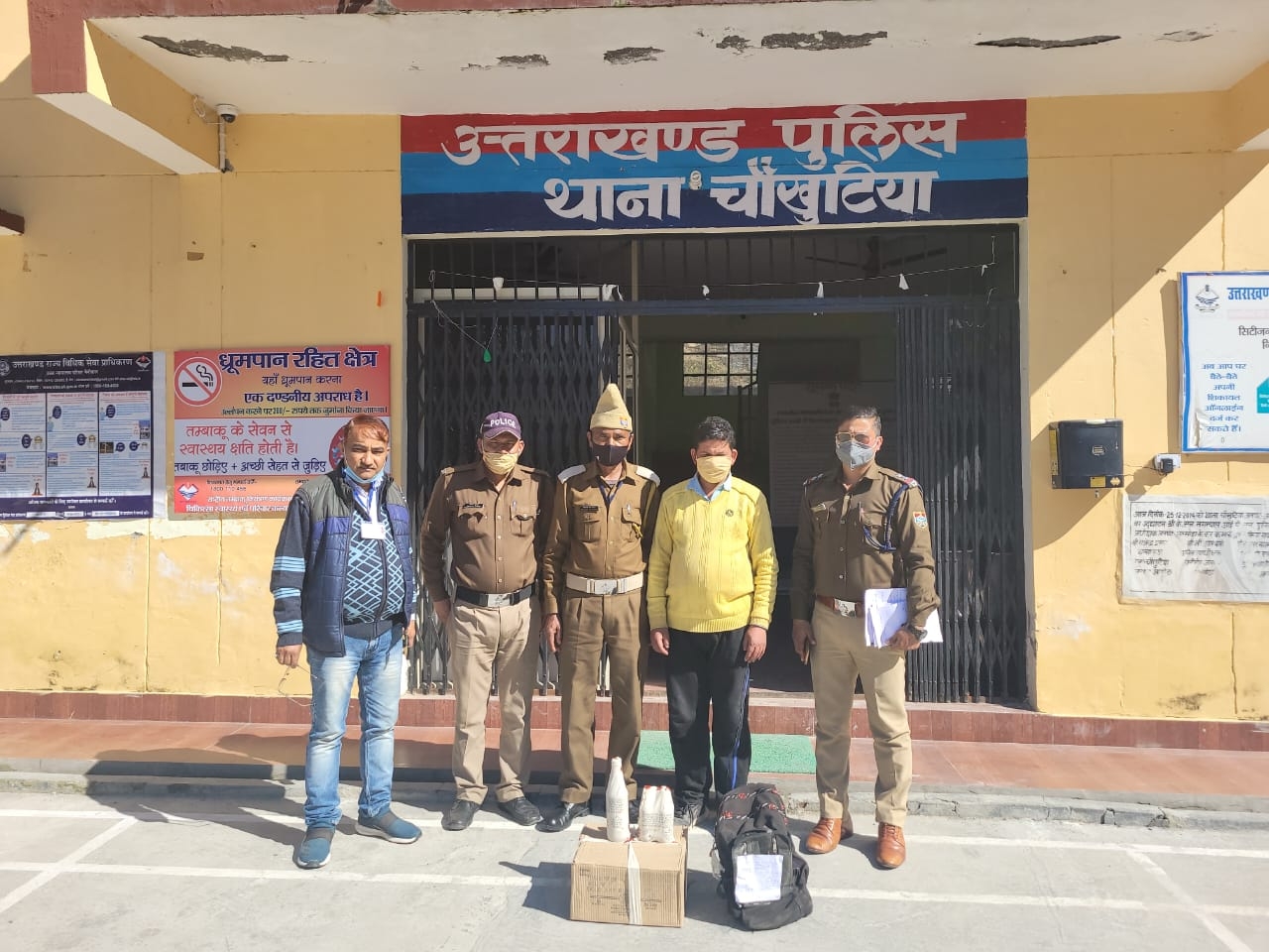 अल्मोड़ा-आगामी विधानसभा चुनाव के दृष्टिगत चल रही चैकिंग के दौरान FST टीम चौखुटिया द्वारा दिनांक 12.02.2022 को चौखुटिया गनाई बाजार क्रांतिवीर चौक के पास लक्ष्मण सिंह अधिकारी पुत्र स्वर्गीय खीम सिंह अधिकारी निवासी ग्राम एवं पोस्ट गनाई थाना चौखुटिया जिला अल्मोड़ा उम्र 38 वर्ष की दुकान अधिकारी आइसक्रीम,सॉफ्टी एवं टी स्टॉल से 30 अध्धे IGL no-1 Gold xxx Rum मार्का अंग्रेजी शराब व 5 बोतल गॉडफादर मार्का बियर अवैध बरामद की गई,जिस संबंध में थाना चौखुटिया में मुकदमा FIR No- 07/2022 धारा 60 आबकारी अधिनियम बनाम लक्ष्मण सिंह अधिकारी उपरोक्त पंजीकृत कराया गया (बरामद शराब और बियर की कीमत 10500रू०) ।गिरफ्तारी/ बरामदगी टीम में रमेश चंद पांडे(मजिस्ट्रेट/ प्रभारी FST चौखुटिया,उ०नि० देवेंद्र सिंह राणा,का० दीपक कुमार,होमगार्ड बलवंत राम शामिल रहे।