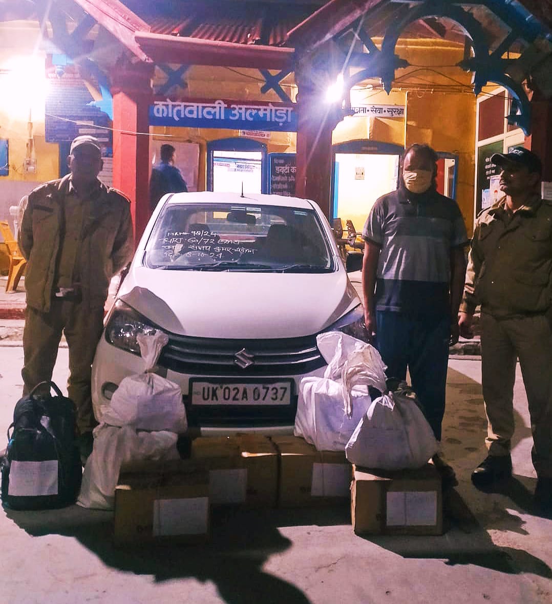 अल्मोड़ा-देवेन्द्र पींचा वरिष्ठ पुलिस अधीक्षक अल्मोड़ा द्वारा आगामी त्यौहारी सीजन के दृष्टिगत समस्त थाना/चौकी व एसओजी/एएनटीएफ प्रभारियों को जनपद में अवैध मादक पदार्थो की तस्करी, बिक्री व भण्डारण करने वालों के विरुद्ध कड़ी कार्यवाही करने के सख्त निर्देश दिये गये है।दिनांक 08/10/2024 की सायं सीओ अल्मोड़ा विमल प्रसाद के पर्यवेक्षण व प्रभारी निरीक्षक कोतवाली अल्मोड़ा जगदीश चन्द्र देऊपा व एसओजी प्रभारी भुवन जोशी के नेतृत्व में कोतवाली अल्मोड़ा पुलिस व एसओजी टीम द्वारा लोधिया बैरियर से 20 मीटर पहले अल्मोड़ा की तरफ संयुक्त चेकिंग की जा रही थी। चेकिंग के दौरान वाहन संख्या UK02-A-0737 सेलेरियो कार को रोक कर चैक किया गया तो अभियुक्त संजय कुमार चंदोला के कब्जे से 84 बोतल अवैध अंग्रेजी शराब व 24 बोतल बियर बरामद होने पर अभियुक्त को गिरफ्तार कर कोतवाली अल्मोड़ा में धारा 60/72 आबकारी अधिनियम में अभियोग पंजीकृत किया गया तथा परिवहन में प्रयुक्त वाहन को सीज किया गया।अभियुक्त ने पूछताछ में बताया कि वह शराब दिल्ली व हल्द्वानी से सस्ते दामों में लाकर बागेश्वर को ले जा रहा था, जिसे बेचकर अधिक मुनाफा अर्जित करने का प्लान था।गिरफ्तार अभियुक्त का नाम संजय कुमार चंदोला उम्र- 41 वर्ष पुत्र धर्मानंद चंदोला निवासी अयारतोली पो0 डंगोली, बैजनाथ जिला बागेश्वर ज्ञै।बरादमगी में अभियुक्त के कब्जे से 84 बोतल अंग्रेजी शराब (जिसमें 48 बोतल बरमूडा रम,18 बोतल बकार्डी ब्लैक रम, 08 बोतल कमान्डर इन चीफ व 10 बोतल कैलेण्डर प्रीमियम रम) व 24 बोतल बियर बरामद हुई हैं जिसकी कीमत- 75,000/- रुपये पचहत्तर हजार रुपये है।कोतवाली अल्मोड़ा/एसओजी पुलिस टीम में