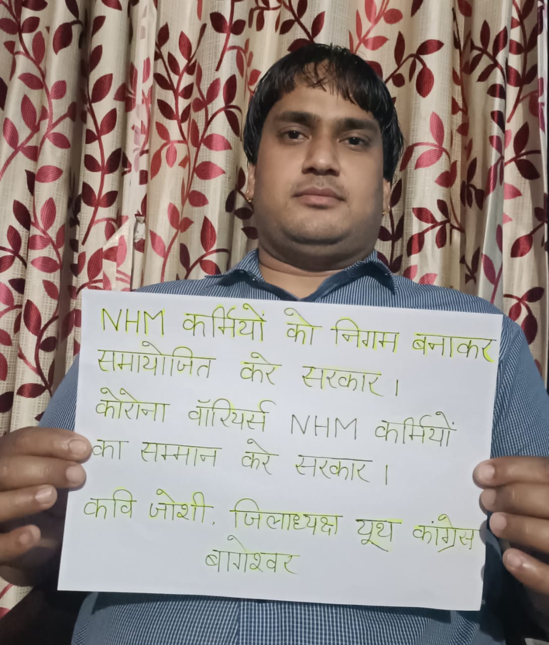 बागेश्वर-आज कवि जोशी जिलाध्यक्ष युवा कांग्रेस बागेश्वर के नेतृत्व में युवा कांग्रेस कार्यकर्ताओं ने राष्ट्रीय स्वास्थ्य मिशन के कर्मचारियों के समर्थन में अपने अपने घरों में सांकेतिक धरना प्रदर्शन किया।कवि जोशी जिलाध्यक्ष युवा कांग्रेस बागेश्वर ने कहा कि राष्ट्रीय स्वास्थ्य मिशन कर्मचारी जो कि कोविड कॉल में फ्रंट लाइन महायोद्धा की भूमिका में है वह सरकार द्वारा अपनी अनदेखी से नाराज होकर कल से काम छोड़ होम आइसोलेशन में है। सरकार द्वारा उनकी सुध नही ली जा रही है वह दैनिक मजदूरी से भी कम मानदेय पर कार्य कर रहे है,न उनकी नौकरी सुरक्षित है और ना ही उनका बीमा है।केंद्र द्वारा दिये जा रहे 15%बोनस को काट कर राज्य सरकार द्वारा उन्हें सिर्फ6.75 बोनस देने ली घोषणा की गई है।इस तरह के सौतेले व्यवहार से सुब्द्ध होकर प्रदेश के समस्त एन एच एम कर्मी होम आइसोलेशन में चले गए है।जिससे कोविड सेम्पलिंग, कोविड रिपोर्टिंग व प्रसव समेत सभी कार्य प्रभावित हो रहे है।ये सरकार की एक ओर नाकामी व लापरवाही को दर्शाता है।सांकेतिक धरना कवि जोशी जिलाध्यक्ष युवा कांग्रेस बागेश्वर,अंकुर उपाध्याय, सुनील पाण्डेय जीवन पांडेय, जयदीप कुमार, उमेश मनराल, उम्मेद गड़िया, खजान खेतवाल, पुष्पेश पंत,राकेश भट्ट, राजेन्द्र पाण्डेय,दर्शन आगरी, रिजवान खान,प्रियांशु पांडेय,रोहित खैर,उमेश पांडेय कमल कोहली,भरत भट्ट,रवि पाण्डेय,लोकेश पाण्डेय द्वारा किया गया।