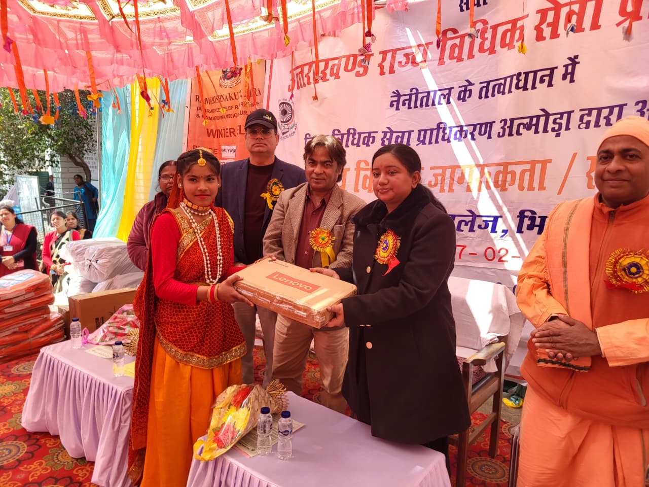 अल्मोड़ा-उत्तराखंड राज्य विधिक सेवा प्राधिकरण नैनीताल के निर्देशन एवं अध्यक्ष जिला विधिक सेवा प्राधिकरण अल्मोड़ा श्रीकांत पाण्डेय के मार्गदर्शन में शचि शर्मा सचिव जिला विधिक सेवा प्राधिकरण अल्मोड़ा की अध्यक्षता में दिनांक 27 फरवरी को अटल उत्कृष्ट राजकीय इंटर कॉलेज भिकियासैंण में वृहद बहुउद्देशीय विधिक जागरुकता एवं साक्षरता शिविर का आयोजन किया गया।सचिव जिला विधिक सेवा प्राधिकरण द्वारा शिविर का शुभारंभ द्वीप प्रज्ज्वलित कर किया गया। शिविर में उपस्थित आम जनता व विद्यार्थियों को नालसा, सालसा,जिला विधिक सेवा प्राधिकरण की स्थापना व कार्यो,माहिलाओं,बच्चों, ट्रांसजेंडर, वरिष्ठ नागरिको आदि के अधिकारों,नालसा टोल फ्री हेल्पलाइन नंबर,चाईल्ड हेल्पलाइन नंबर 1098, निःशुल्क विधिक सहायता आदि के विषय में जागरूक किया गया व नालसा थीम सॉंग सुनवाया गया।शिविर में सांस्कृतिक कार्यक्रमों में प्रतिभाग करने वाले छात्र छात्राओ को सर्टिफिकेट एवं अन्य लाभार्थियों को 2 लैपटॉप, 10 टैबलेट,11 व्हीलचेयर,100 छड़ी,54 कान की मशीन,25 वॉटर प्यूरीफायर,4 महालक्ष्मी किट,2 क्रिकेट किट,2 बैडमिंटन किट,2 बास्केट बॉल,8 सिलाई मशीन आदि प्रदान की गई।शिविर में 100 कंबल राम कृष्ण कुटीर अल्मोड़ा के सहयोग से वितरित किए गए।शिविर में स्वास्थ्य विभाग द्वारा निःशुल्क स्वास्थ्य परीक्षण किया गया।निःशुल्क दवाइयाँ वितरित की गई तथा 15 दिव्यांगता प्रमाण पत्र भी बनाये गये।हैडाखान चैरिटेबल ट्रस्ट चिलियानौला रानीखेत द्वारा निःशुल्क नेत्र परीक्षण किया गया व निःशुल्क चश्मे वितरित किए गए।अन्य विभागों के अधिकारीगण द्वारा अपने विभागों की कल्याणकारी योजनाओं की जानकारी प्रदान की गई।विभिन्न योजनाओं का लाभ दिया गया।कार्ड आदि बनाए गये व स्टाल लगाये गये।शिविर में राम कृष्ण कुटीर अल्मोड़ा से स्वामी मायाधिशानंद,उप जिलाधिकार याक्षी अरोड़ा, प्रभारी खण्ड शिक्षा नीरज लोहनी,खंड विकास अधिकारी गोपाल सिंह नेगी,बाल विकास परियोजना अधिकारी मुकेश कुमार,जिला आयुर्वेदिक एवं यूनानी अधिकारी मो साहिद,डीपीओ अल्मोड़ा कल्पना मनराल, प्रधानाचार्य भवानी राम भारती आदि उपस्थित रहें।शिविर में विभिन्न विद्यालयों के विद्यार्थियों द्वारा सरस्वती वंदना,स्वागत गीत,कुमाऊँनी नृत्य,दो नुक्कड़ नाटक,गीत व भाषण आदि प्रस्तुत किये गये।सचिव जिला विधिक सेवा प्राधिकरण द्वारा विभिन्न विभागों द्वारा लगाये स्टालो का निरीक्षण किया गया एवं आम जनता को दी गई सहायता व लाभ के विषय में जानकारी ली गई।द्वाराहाट, ताकुला व अल्मोड़ा के अधिकार मित्र द्वारा हैल्प डैस्क व विधिक स्टॉल के माध्यम से आमजनता की सहायता की गई व लगभग 2000 निःशुल्क कानूनी पंफ्लेटों का वितरण किया ग