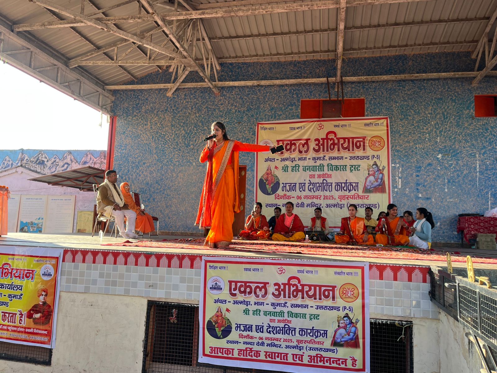 अल्मोड़ा-राष्ट्रीय स्वयंसेवक संघ की प्रेरणा से संचालित एकल अभियान अंचल अल्मोड़ा भाग कुमाऊँ उत्तराखंड के तत्वावधान में नन्दा देवी मंदिर गीता भवन में भजन एवं भक्ति कार्यक्रम का भव्य आयोजन किया गया।कार्यक्रम में भक्तिभाव,देशभक्ति और लोकसंस्कृति की झलक के साथ ग्राम्य जीवन के उत्थान का संदेश दिया गया।कार्यक्रम में मुख्य अतिथि विभाग प्रचारक राष्ट्रीय स्वयंसेवक संघ एवं माता श्री शारदा मठ रही।एकल अभियान समिति से कुमाऊँ भाग अध्यक्ष प्रमोद बिष्ट, अल्मोड़ा अंचल अध्यक्ष त्रिलोचन जोशी,कार्यक्रम संयोजक मनीष जोशी,पूर्व विधायक कैलाश शर्मा,मेयर अजय वर्मा,नगर अध्यक्ष विनीत बिष्ट,मंडल अध्यक्ष नवीन बिष्ट, ललित लटवाल,मनोज तिवारी आदि उपस्थित रहे।