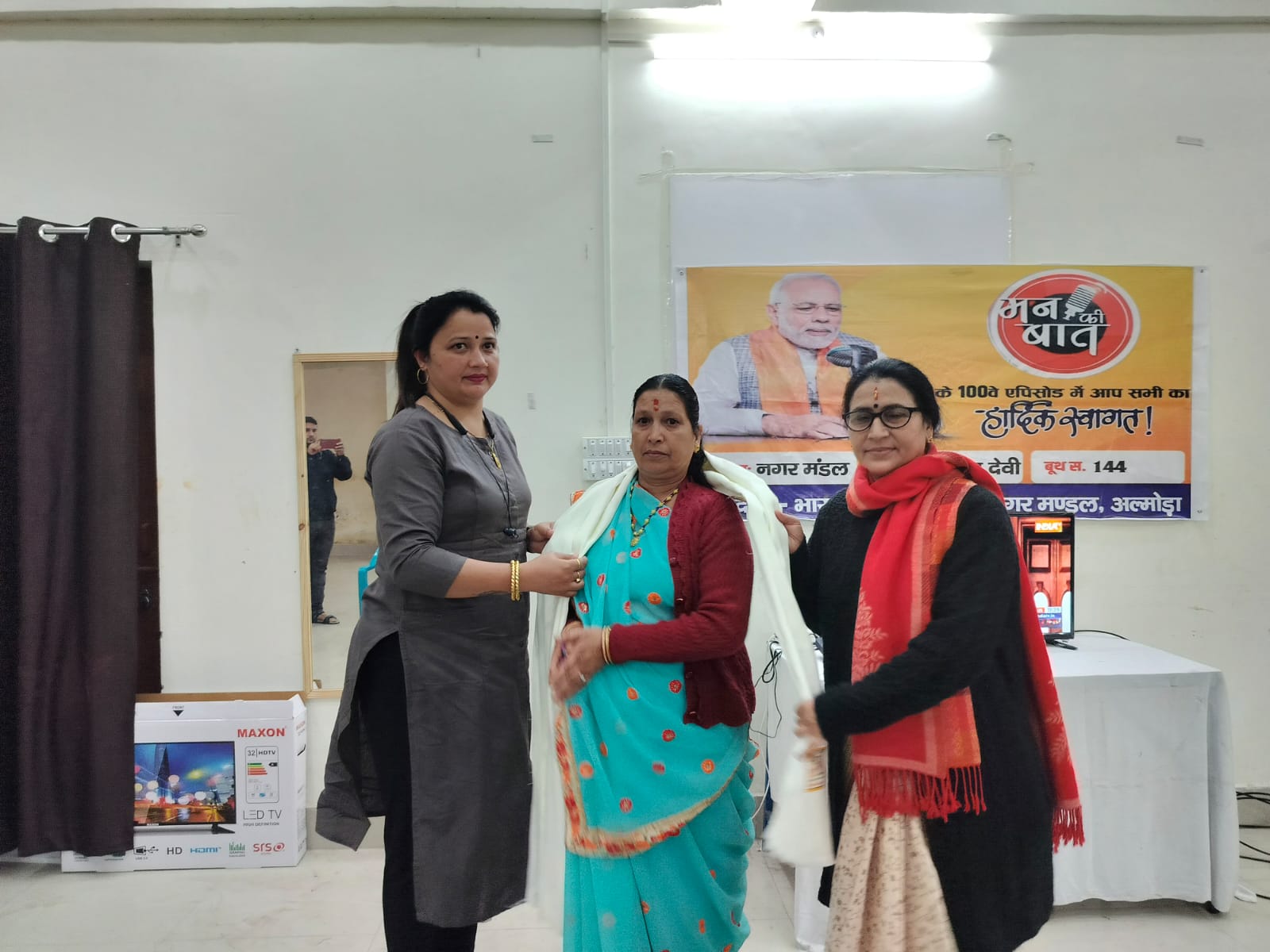 अल्मोड़ा-आज देश के प्रधानमंत्री नरेन्द्र मोदी के मन की बात कार्यक्रम के 100 वे एपिसोड के उपलक्ष्य में शक्ति केंद्र नंदा देवी में कार्यक्रम का प्रसारण किया गया व देश के वीर शहीदों द्वारा देश के लिए दिये गये बलिदान के लिए उनके परिवारजनों को सम्मानित किया गया।वंही क्षेत्र के लोगो ने भी मन की बात कार्यक्रम में बढ़ चढ़ कर हिस्सा लिय।मन की बात कार्यक्रम के समापन के बाद देश के लिए शहीद हुए क्षेत्र के शहीदों के परिजनों को सम्मानित किया। इस अवसर पर भाजपा महिला मोर्चा की प्रदेश उपाध्यक्ष श्रीमती किरण पंत ने कहा कि आज एक इतिहास कायम हो गया है। 2014 से जब से प्रधानमंत्री नरेंद्र मोदी ने देश की बाग डोर संभाली है तब से लेकर आज तक प्रत्येक महीने लोगो से संवाद किया और नई नई जानकारी दी।जिससे कई लोग अपने पैरों पर खड़े हो गए और कुछ लोगो ने विषम परिस्थितियों में काम करके इतिहास बनाया।आज तक 100 करोड़ लोग मन की बात कार्यक्रम को देख चुके है और मन कि बात कार्यक्रम सिर्फ भारत मे नही विदेशों में भी प्रसिद्ध हो रहा है और कई लोग मन की बात कार्यक्रम में मोदी जी की बातों को सुनकर भारत निर्माण में लग गए है और शहीदों को ऐसे अवसरों पर लगातार सम्मान दिया जा रहा है।उन्होंने कहा कि आज के कार्यक्रम में भी शहीदो के परिवारजनों को सम्मान दिया गया।क्योंकि आज उनकी वजह से ही हम खड़े है।कार्यक्रम में पूर्व विधायक रघुनाथ चौहान,नगर अध्यक्ष अमित शाह,महिला मोर्चा प्रदेश उपाध्यक्ष किरण पंत, महामंत्री अर्जुन बिष्ट सहित प्रदेश और जिला पदाधिकारी तथा जनता उपस्थित रही।