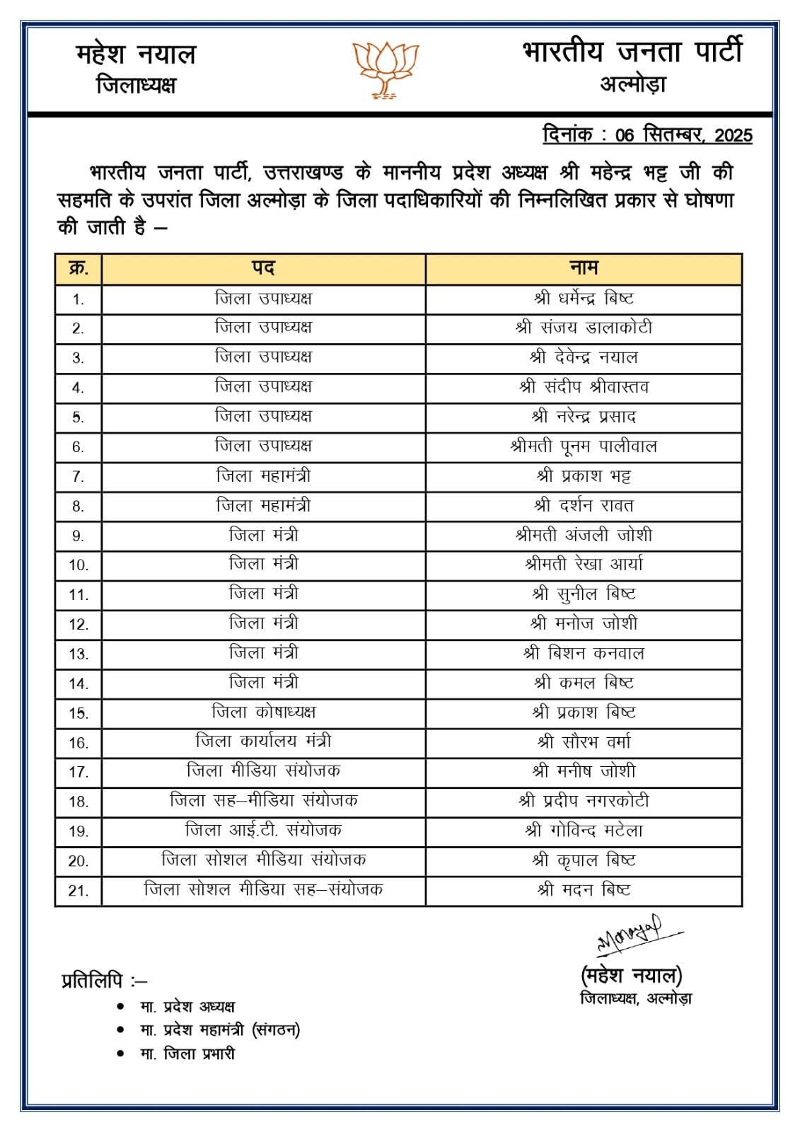 अल्मोड़ा -भाजपा ने अल्मोड़ा में घोषित की जिला कार्यकारिणी। Post navigation श्रुतिका को मिला श्रेष्ठ शिक्षक सम्मान जिला मीडिया संयोजक बनाए जाने पर मनीष कुमार जोशी ने किया शीर्ष नेतृत्व का आभार व्यक्त