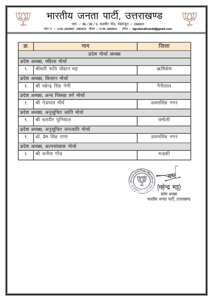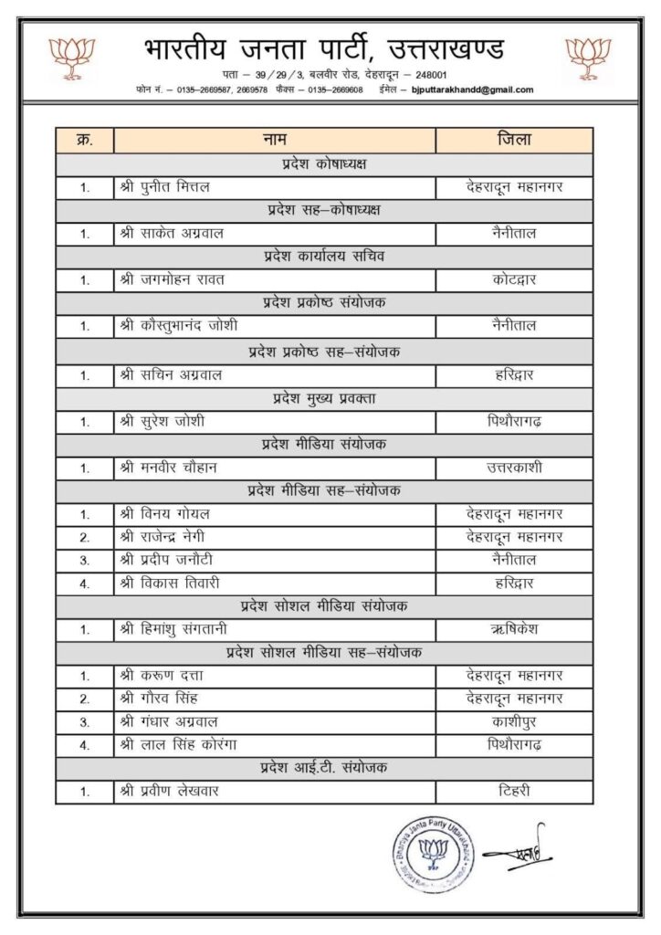 देहरादून-भाजपा ने प्रदेश पदाधिकारियों की घोषणा कर दी है।प्रदेश अध्यक्ष महेंद्र भट्ट के निर्देश पर संगठन के विभिन्न मोर्चो और विभाग मे 42 लोगों को दायित्व दिये गए है।दीप्ति रावत, कुंदन परिहार और तरुण बंसल को महामंत्री बनाया गया है।वहीं प्रदेश उपाध्यक्ष के पद पर 8, प्रदेश मंत्री के पद पर 8 लोगों को नियुक्ति दी गयी है।पुनीत मित्तल प्रदेश कोषाध्यक्ष तथा मनवीर सिंह चौहान को तीसरी बार मीडिया प्रभारी बनाया गया है।रुचि भट्ट को महिला मोर्चा का अध्यक्ष तथा अन्य मोर्चो मे भी नियुक्ति की गयी है।