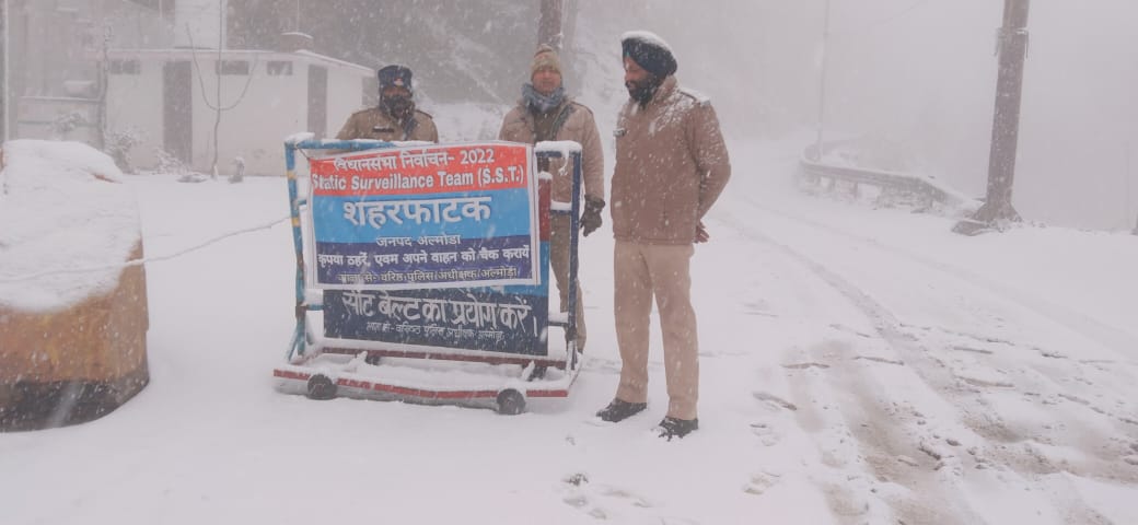 अल्मोड़ा-चुनाव के दृष्टिगत एसएसपी अल्मोड़ा डॉ० मंजूनाथ टीसी के निर्देश पर अल्मोड़ा पुलिस हाई अलर्ट मोड पर है।एसएसपी अल्मोड़ा द्वारा भी स्वयं बर्फबारी के बीच लगातार कर्मचारियों को ड्यूटी के दौरान निर्देश के साथ साथ उत्साहवर्धन किया जा रहा है।एसएसटी टीमों द्वारा भारी बर्फबारी के बीच जनपद की सीमाओं में बने बैरियरों में मुस्तैदी से ड्यूटी का निर्वहन कर वाहनों की चैकिंग की जा रही है।