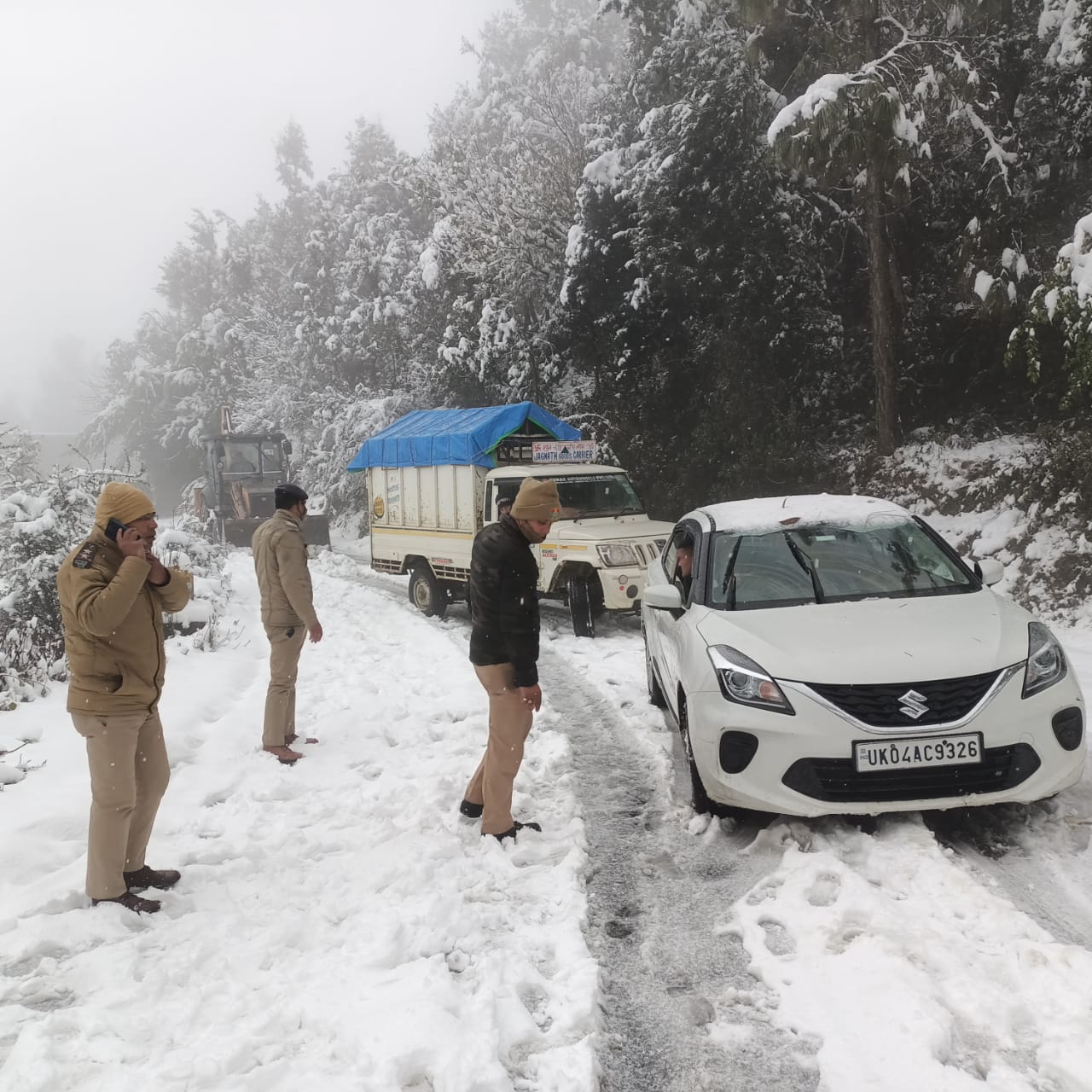 अल्मोड़ा-जनपद अल्मोड़ा में लगातार हो रही भारी बर्फबारी के चलते अल्मोड़ा पिथौरागढ़ मोटर मार्ग में लगभग 100 से ज्यादा वाहन फॅसे हुए थे, सूचना प्राप्त होने पर थानाध्यक्ष दन्या सुशील कुमार द्वारा मय पुलिस बल मौके पर पहुंचकर मार्ग खोलने हेतु 02 जेसीबी लगायी गयी, तथा पुलिस बल द्वारा फॅसे हुए पर्यटकों व अन्य को स्थानीय होटल, रिजार्ट, स्थानीय लोगों तथा पुलिस कर्मियों के आवास में ठहराकर उनके खाने पीने की व्यवस्था की गयी। पर्यटकों द्वारा अल्मोड़ा पुलिस की सराहना की गई।