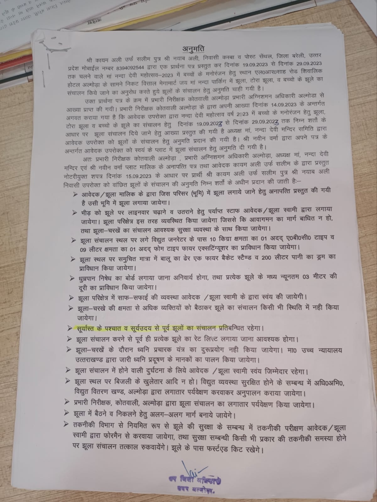 अल्मोड़ा-नन्दादेवी मेले में एडम्स परिसर में चल रहे झूलों के लिए प्रशासन से अनुमति नहीं ली गयी है।उप जिलाधिकारी ने बताया कि केवल शिवालिक होटल के सामने लगे झूलों के लिए अनुमति दी गयी है। उन्होंने कहा कि उनके द्वारा कोतवाल को इस सम्बन्ध में निर्देशित कर दिया है कि बिना अनुमति के जो झूले चल रहे हैं तत्काल उन पर कार्यवाही की जाए। शिवालिक के सामने लगे झूलों को भी सूर्यास्त के बाद संचालित करने की अनुमति प्रशासन द्वारा नहीं दी गयी है।सोचने वाली बात है बिना अनुमति के चल रहे इन झूलों से यदि कोई दुर्घटना होती है तो इसकी जवाबदेही किसकी होगी।अब देखने वाली बात यह है कि प्रशासन बिना अनुमति चल रहे इन झूलों पर कब रोक लगाता है।