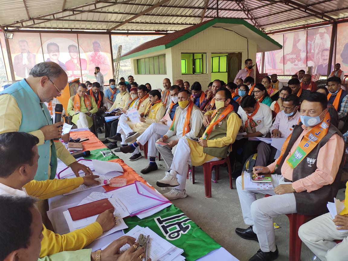 सल्ट-भाजपा के प्रदेश महामंत्री एवं सल्ट विधानसभा उपचुनाव के चुनाव प्रभारी सुरेश भट्ट ने गुरूवार को सभी शक्ति केन्द्र संयोजकों,शक्तिकेन्द्र प्रभारीयों,मण्डल अध्यक्षों,मण्डल महामंत्रियों,जिलापदाधिकारीयों एवम् सभी मोर्चों के अध्यक्षों की बैठक ली। इस बैठक में कैबिनेट मंत्री यशपाल आर्य,राज्यमंत्री धन सिंह रावत,प्रदेश उपाध्यक्ष कैलाश शर्मा,जिलाध्यक्ष रवि रौतेला ने कार्यकर्ताओं को इस चुनाव में पूरी तन्मयता से जुट जाने का आह्वान किया और भाजपा प्रत्याशी महेश जीना को प्रचंड जीत दिलवाकर केन्द्र की मोदी एवं राज्य की तीरथ रावत सरकार के हाथों को और मजबूत करने का आह्वान किया।सभी वक्ताओं ने एक स्वर में कहा कि सभी शक्ति केन्द्र जनसम्पर्क का कार्यक्रम तय करें और उसके अनुरूप कार्य करते हुए क्षेत्र के प्रत्येक मतदाता तक केन्द्र एवं राज्य सरकार की कल्याणकारी योजनाओं की जानकारी पहुँचायें।बैठक में प्रमुख रूप से भाजपा प्रत्याशी महेश जीना,जिला महामंत्री महेश नयाल,प्रेम शर्मा,जिला सह मीडिया प्रभारी संदीप सिंह भोज, दिनेश मेहरा,राधा धौलाखण्डी,मण्डल अध्यक्ष देवी दत्त शर्मा,पूरन रजवार, मनवर सिंह,विक्रम सिंह,हरीश कोटिया,प्रताप रावत,हंसा नेगी,मंजू रावत,पिंकी करगेती,प्रवीन कुमार,मुकेश भट्ट,हरि राम मौजूद रहे।