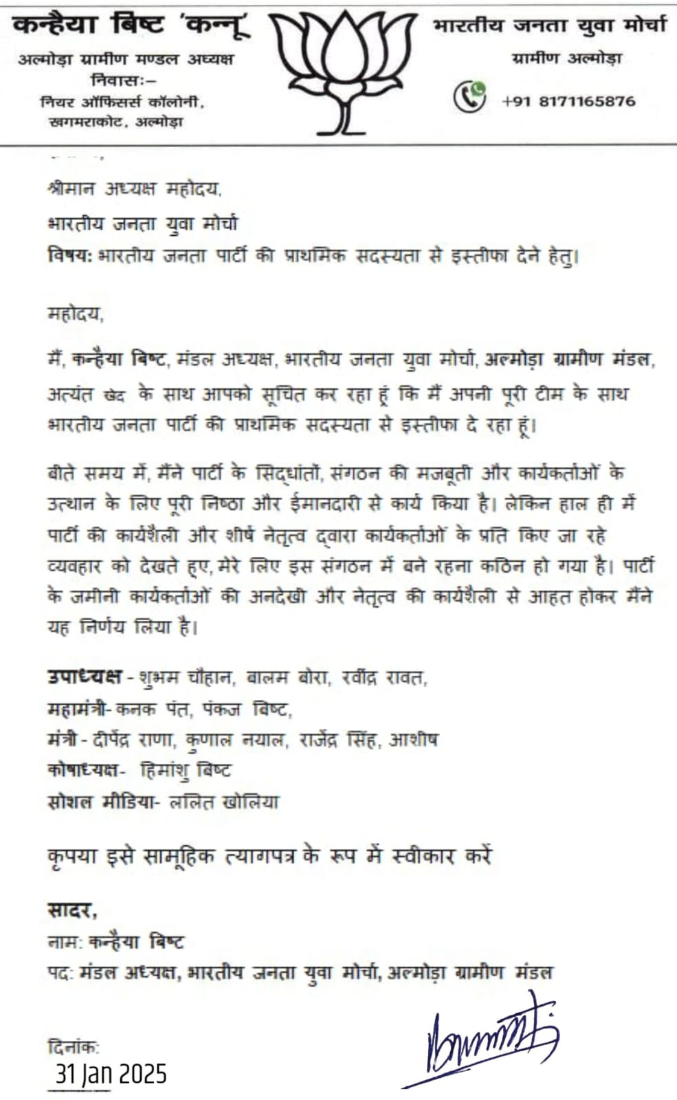 अल्मोड़ा-भारतीय जनता युवा मोर्चा के अल्मोड़ा ग्रामीण मंडल अध्यक्ष कन्हैया बिष्ट ने अपनी टीम के साथ पार्टी की प्राथमिक सदस्यता से इस्तीफा देने की घोषणा की है। जिलाध्यक्ष भाजयुमो के नाम दिए पत्र में उन्होंने कहा कि अब तक उन्होंने पूरी निष्ठा और ईमानदारी के साथ पार्टी के सिद्धांतों, संगठन की मजबूती और कार्यकर्ताओं के उत्थान के लिए कार्य किया। लेकिन हाल ही में पार्टी के कार्यकर्ताओं के प्रति उच्च नेतृत्व के व्यवहार और संगठन में बढ़ती आंतरिक गुटबाजी से वे आहत हुए हैं। नेतृत्व की अनदेखी और कार्यशैली से निराश होकर उन्होंने अपने पूरे सहयोगी दल के साथ पार्टी छोड़ने का निर्णय लिया है। इस सामूहिक इस्तीफे में उनके साथ शुभम चौहान, बालम बोरा, रवींद्र रावत (उपाध्यक्ष), कनक पंत, पंकज बिष्ट (महामंत्री), दीपेंद्र राणा, कुणाल नयाल, राजेंद्र सिंह, आशीष (मंत्री), हिमांशु बिष्ट (कोषाध्यक्ष) और ललित खोलिया (सोशल मीडिया प्रभारी) भी शामिल हैं। उन्होंने अनुरोध किया है कि इस पत्र को सामूहिक त्यागपत्र के रूप में स्वीकार किया जाए।