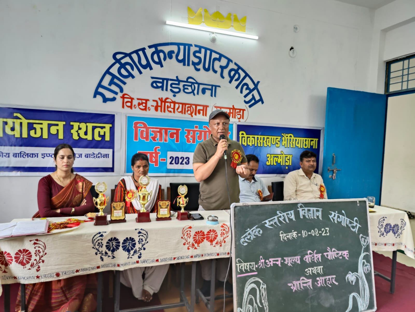 अल्मोड़ा-आज राजकीय कन्या इंटर कॉलेज बाड़ेछीना में विकासखंड भैंसियाछाना की ब्लॉक स्तरीय विज्ञान संगोष्ठी प्रतियोगिता का आयोजन किया गया। इस अवसर पर खंड शिक्षा अधिकारी हरीश रौतेला ने छात्र छात्राओं को मोटे अनाजों के महत्व के विषय में जानकारी देते हुए विज्ञान का हमारे जीवन में महत्व बताया। इस प्रतियोगिता में विकासखंड भैंसिया छाना के विभिन्न विद्यालयों के छात्र छात्राओं ने प्रतिभाग किया। कार्यक्रम का शुभारंभ खंड शिक्षा अधिकारी के द्वारा दीप प्रज्वलन कर किया गया। इसके पश्चात छात्राओं द्वारा सरस्वती वंदना तथा स्वागत गीत प्रस्तुत किए गए। ब्लॉक स्तरीय विज्ञान संगोष्ठी प्रतियोगिता में राजकीय कन्या इंटर कॉलेज बाड़ेछीना की कुमारी गीता सुप्याल ने प्रथम स्थान तथा इसी विद्यालय की कुमारी समृद्धि कार्की ने द्वितीय स्थान तथा सरस्वती शिशु मिशन स्कूल नौगांव रीठगाड की कुमारी तृप्ति चम्याल ने तृतीय स्थान प्राप्त किया। कार्यक्रम के समापन पर प्रधानाचार्या श्रीमती प्रीति पंत द्वारा सभी को धन्यवाद ज्ञापित किया गया। इस अवसर पर ब्लॉक विज्ञान समन्वयक नवीन चंद्र उपाध्याय, सह विज्ञान समन्वयक किशोर थापा, राजकीय कन्या इंटर कॉलेज बाड़ेछीना की प्रधानाचार्या श्रीमती प्रीति पंत, विज्ञान शिक्षिकाएं श्रीमती तनुप्रिया खुल्बे, श्रीमती आशा भट्ट, कुमारी रेखा मेहता, श्रीमती शैलजा नयाल, श्रीमती कमला बिष्ट, श्रीमती शिप्रा बिष्ट, श्रीमती पुष्पा भट्ट, श्रीमती किरण पाटनी, श्रीमती ममता भट्ट, कुमारी प्रियंका, कुमारी भावना बिष्ट,श्रीमती हेमा पटवाल तथा मुख्य अतिथि अभिभावक संघ अध्यक्ष श्रीमती वीना चम्याल उपस्थित थे।