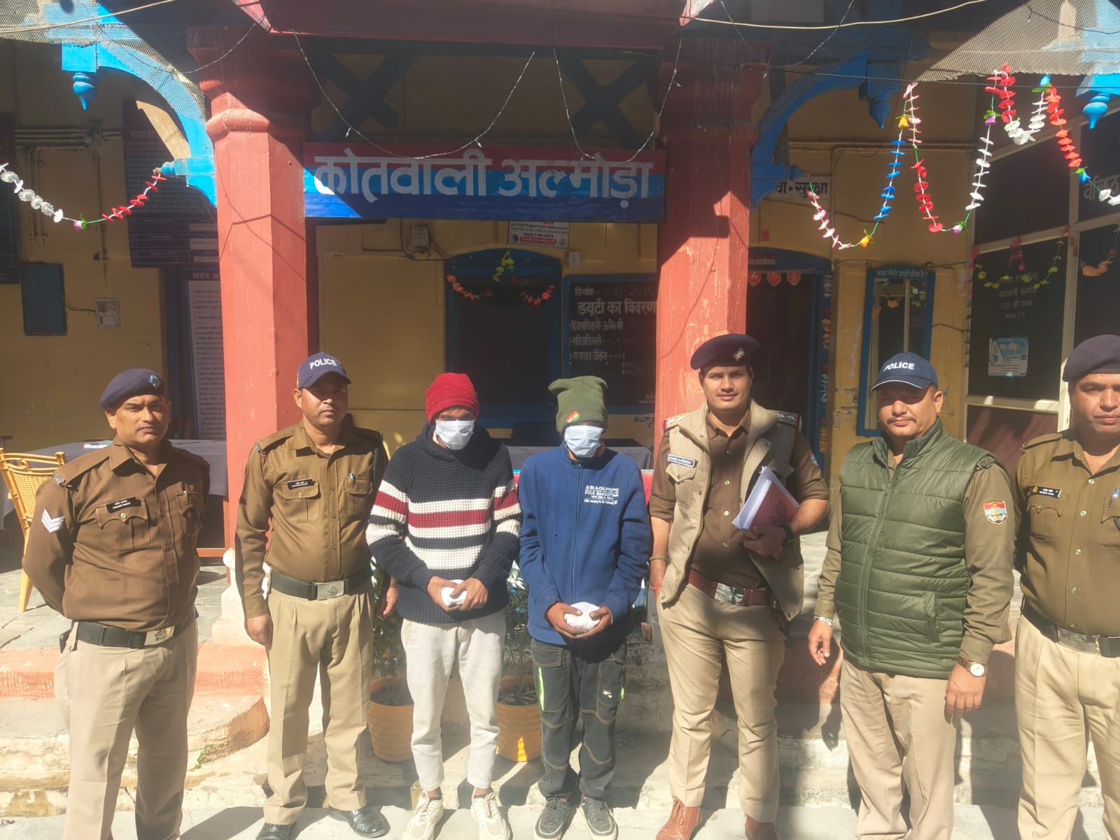 अल्मोड़ा-देवेन्द्र पींचा वरिष्ठ पुलिस अधीक्षक अल्मोड़ा द्वारा नशे के विरुद्ध जीरो टाँलरेन्स की नीति अपनाकर जनपद के समस्त थाना प्रभारियों एवं एएनटीएफ/एसओजी टीम को नशा तस्करों के विरुद्ध कड़ी कार्यवाही करने के सख्त निर्देश दिये गये है।दिनांक 7.11.2025 को अपर पुलिस अधीक्षक हरबन्स सिंह व सीओ अल्मोड़ा गोपाल दत्त जोशी के पर्यवेक्षण में प्रभारी निरीक्षक कोतवाली अल्मोड़ा योगेश चन्द्र उपाध्याय व निरीक्षक भुवन जोशी प्रभारी एसओजी के नेतृत्व में संयुक्त टीम द्वारा चेकिंग के दौरान फलसीमा से टाटिक हैलपैड की ओर पर मोटरसाइकिल संख्या-UP21-AL-3762 को चैक किया गया तो मोटर साइकिल में सवार दो युवक पंकज कुमार व मनोज कुमार के कब्जे से कुल 656 ग्राम अवैध चरस बरामद कर अभियुक्तों को गिरफ्तार करते हुए कोतवाली अल्मोड़ा में एफआईआर नं0-95/2025 धारा 8/20/60 एनडीपीएस एक्ट के अन्तर्गत अभियोग पंजीकृत कर आवश्यक कार्यवाही की गई है। वाहन को सीज किया गया।गिरफ्तार अभियुक्तों का नाम/पता पंकज कुमार उम्र- 23 वर्ष पुत्र मोहन चन्द्र निवासी ग्राम सिलालेख पहाड़पानी थाना मुक्तेश्वर जिला नैनीताल एवं मनोज कुमार उम्र- 26 वर्ष पुत्र सुरेश चन्द्र निवासी उपरोक्त है।बरामदगी में 656 ग्राम चरस बरामद हुई है जिसकी कीमत 1,31,200 रुपये है।पुलिस टीम में उ0नि0 आनन्द बल्लभ कश्मीरा प्रभारी चौकी धारानौला, कानि राजीव जोशी कोतवाली अल्मोड़ा,कानि हरीश प्रसाद एसओजी अल्मोड़ा,कानि चन्दन सिंह एसओजी अल्मोड़ा शामिल रहे।