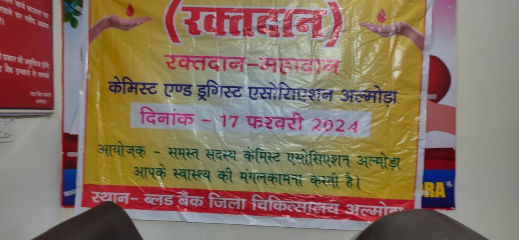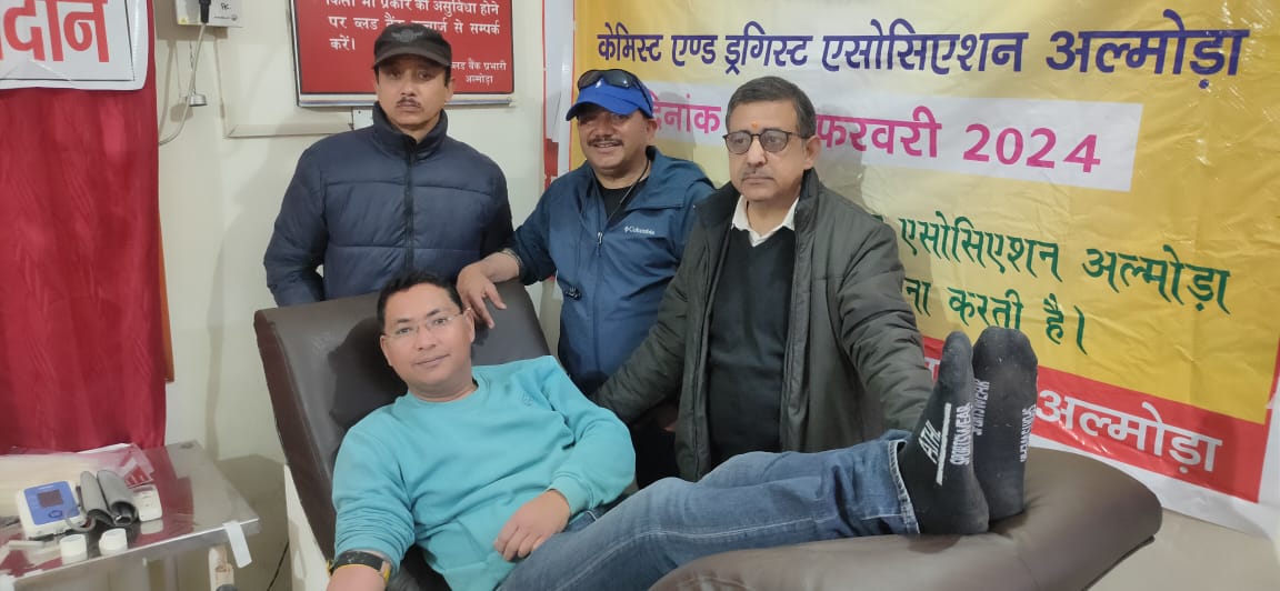 अल्मोड़ा-आज दिनांक 17 फरवरी 2024 को केमिस्ट एसोसिएशन अल्मोड़ा द्वारा ज़िला चिकित्सालय के रक्तकोष में रक्तदान शिविर का आयोजन किया गया।शिविर में एसोसिएशन के पदाधिकारी तथा सदस्य मौजूद रहे।प्रातः 11 बजे से सदस्यों द्वारा रक्तदान के लिए लाइन लगी रही।रक्त के जिन ग्रुपों का ब्लड बैंक में अभाव था उनको प्राथमिकता के आधार पर लिया गया।ज़िला चिकित्सालय के प्रमुख अधीक्षक डॉ हरीश गड़कोटी,प्रभारी ब्लड बैंक डॉ साही समेत ब्लड बैंक के सभी कर्मियों ने सहयोग के लिए एसोसिएशन द्वारा आभार जताया गया।शिविर मे राजेंद्र प्रसाद जोशी,कैलाश चंद्र,दीप वर्मा, राजेन्द्र बिष्ट,तरुनकुमार,सुनील कुमार, दीप डालाकोटी,जितेंद्र वर्मा,राकेश सिंह ,सौरभ ,पूरन ,अभिषेक, साहिल भुवन कुमार ,जीवन बिष्ट ,देवेश पंत योगेश ,श्याम ,रोहित वर्मा प्रमोद घिल्डियाल ,वरदान विनायक ,रोशनी ,अंकिता समेत क़रीब २५ रक्तदाताओं द्वारा रक्तदान किया गया।प्रांतीय अध्यक्ष बी एस मनकोटी की पत्नी वंदना तथा गौरव मनकोटी द्वारा भी रक्तदान किया गया।इस शिविर में रेड क्रॉस के चेयरमैन मनोज सनवाल,किशन गुरूरानी,आशीष वर्मा,गिरीश उप्रेती,कस्तूरी लाल ,राघव पन्त द्वारा सहयोग दिया गया।