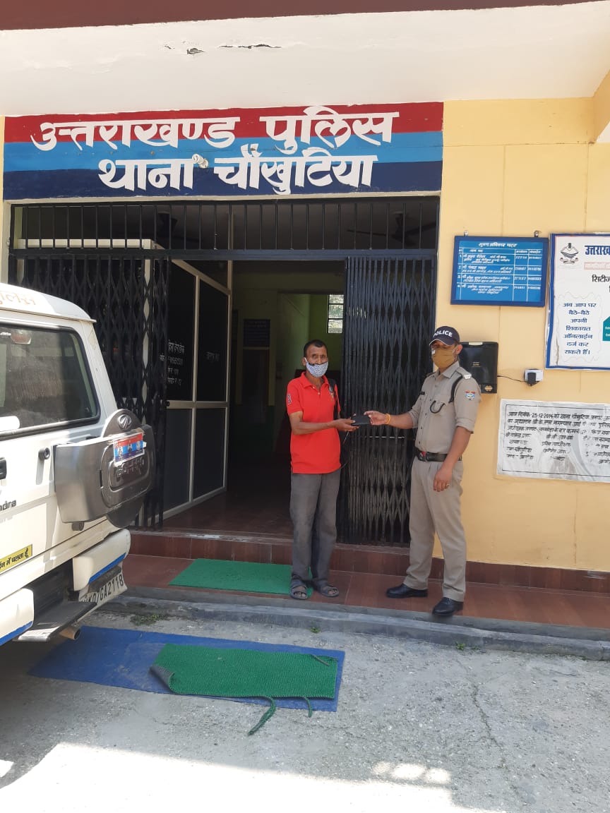 चौखुटिया-आज उप निरीक्षक मनमोहन सिंह मेहरा मय हमराही कानि० नापु० विरेन्द्र राय,कानि० नापु० प्रदीप सिंह रौतेला के कोविड 19 संक्रमण के दृष्टिगत देखरेख शान्ति व कानून व्यवस्था ड्यूटी के कस्बा चौखुटिया में भ्रमण के दौरान संगेला लाँज चौखुटिया के समीप एक लावारिस पर्स गिरा पड़ा मिला।जिसमें 1500 रुपये नगद व अन्य महत्तवपूर्ण दस्तावेज थे।उक्त पर्स के स्वामी के सम्बन्ध में आप-पास काफी पूछताछ करने पर उक्त पर्स का दयाकृष्ण पुत्र स्व० पनी राम निवासी ग्राम ढौन पोस्ट भटकोट थाना चौखुटिया जनपद अल्मोड़ा उम्र-65 वर्ष का होना प्रकाश में आया। जिन्हें ग्राम प्रधान के जरिये अवगत कराकर अपना पर्स लेने हेतु थाना हाजा बुलवाया गया तथा तस्दीक कर उक्त पर्स को उनके सुपुर्द किया गया। अपना पर्स व रूपये वापस पाकर दयाकृष्ण बहुत प्रसन्न हुए तथा थाना पुलिस का आभार व्यक्त किया।