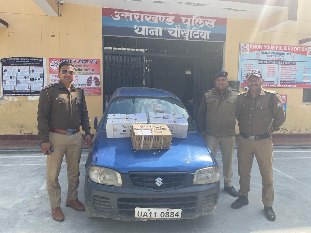 अल्मोड़ा-एसएसपी अल्मोड़ा डा० मंजूनाथ टी०सी०द्वारा समस्त थाना/ चौकी प्रभारियों एवं एस०ओ०जी० टीम को अवैध मादक पदार्थों की तस्करी,अवैध शराब की बिक्री एवं तस्करी पर अंकुश लगाये जाने हेतु सघन चैकिंग अभियान चलाकर कार्यवाही करने के निर्देश दिये गये है।दिनांक 2.03.2022 को उ०नि० उ०न० देवेन्द्र सिंह राणा,आरक्षी दीपक कुमार द्वारा दौराने चैकिंग चौखुटिया पेट्रौल पम्प से आगे पाण्डवाखाल रोड के पास संदिग्ध प्रतित होने पर वाहन संख्या UA11-0884 आल्टो कार से 2 पेटियों में 96 पव्वे अवैध अंग्रेजी शराब,एक गत्ते की पेटी में 24 कैन बियर कीमत 18,500रु बरामद कर थाना चौखुटिया में मु०अ०सं० 09/22 धारा 60/72 आबकारी अधिनियम बनाम अज्ञात के अन्तर्गत अभियोग पंजीकृत कर आवश्यक कार्यवाही की जा रही है।उ०नि० देवेन्द्र सिंह राणा थाना चौखुटिया वाहन चालक अंधेरे का फायदा उठाकर मौके से फरार हो गया,जिसकी मिलने के सम्भावित स्थानों में ढुंढ खोज की जा रही है।