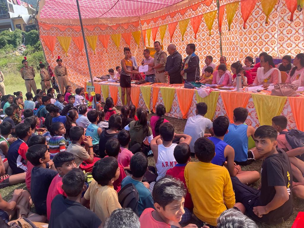 अल्मोड़ा-आज दिनांक 13.10.2022 को थानाध्यक्ष दिनेश नाथ महंत थाना चौखुटिया द्वारा मासी मैदान मे खेल महाकुंभ 2022 में आए विभिन्न स्कूलों के एनसीसी कैडेटों व छात्र-छात्राओं को नशे से होने वाले दुष्प्रभाव के बारे में जानकारी देते हुए,जीवन में कभी नशा न करने के लिए प्रेरित किया गया।यह भी बताया गया कि आपके गाँव में या आसपास कोई भी व्यक्ति किसी भी प्रकार की नशे से सम्बंधित पदार्थ बेचता है,उसकी सूचना पुलिस को दे।इसके साथ साथ यातायात नियमों,महिला सुरक्षा संबंधी कानून हेल्पलाइन नंबर 1090,साइबर अपराध,बाल अपराध के संबंध मे विस्तृत रूप से जानकारी दी गई। साइबर अपराध से संबंधित टोल फ्री नंबर 1930, उत्तराखण्ड पुलिस एप तथा यातायात के नियमों के संबंध में जानकारी दे कर जागरूक किया गया।