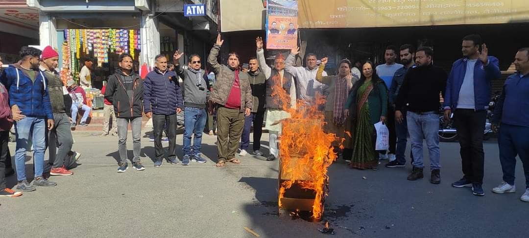 बागेश्वर-प्रदेश कांग्रेस अध्यक्ष करन मेहरा के निर्देशानुसार जिला कांग्रेस कमेटी बागेश्वर द्वारा आज कांग्रेस जिलाध्यक्ष लोकमणि पाठक के नेतृत्व में देवभूमि को कलंकित करने वाले अंकिता हत्याकांड में संलिप्त वीवीआईपी के नामों का खुलासा करने और उक्त मामलें की सीबीआई जांच की मांग को लेकर स्टेट बैंक चौराहे पर भाजपा सरकार का पुतला दहन किया।इस अवसर पर कांग्रेस जिलाध्यक्ष लोकमणि पाठक ने कहा कि बेटी पढ़ाओ बेटी बचाओ का नारा देने वाली भाजपा सरकार में महिलाओं पर अत्याचार की घटनाएं लगातार बढ़ती जा रही हैं।उन्होंने कहा कि भाजपा सरकार अपराधियों को बचाने और सबूत मिटाने के काम में लगी है। उन्होंने कहा कि देवभूमि की जनता भाजपा सरकार को कभी माफ नहीं करेगी।उन्होंने आगे कहा कि जब तक उत्तराखण्ड की बेटी अंकिता भण्डारी को न्याय नहीं मिल जाता कांग्रेस का विरोध प्रदर्शन जारी रहेगा।इस अवसर पर दर्जनों की संख्या में कांग्रेसजन उपस्थित रहे तथा पुतला दहन से पूर्व भाजपा सरकार के खिलाफ जमकर नारेबाजी की।पुतला दहन कार्यक्रम में जिलाध्यक्ष लोकमणि पाठक,यूथ कांग्रेस जिलाध्यक्ष कवि जोशी,नगर अध्यक्ष सुनील पाण्डे,एन एस यू आई जिलाध्यक्ष गोकुल परिहार,नगर उपाध्यक्ष राहुल कुमार,नगर सचिव निक्कू,नगर उपाध्यक्ष अज्जू,दीपक मिश्रा,नगर उपाध्यक्ष युवा कांग्रेस संस्कार भारती,कमल कोहली,चन्दन कोरंगा,किशन कठायत, हेमन्त कुमार,विनोद पाठक,रोहित खैर,राकेश भट्ट,रिजवान खान,विशाल रावत,सुनीता टम्टा,मयंक पंत,गीता रावल, ललित बिष्ट,किशन गिरी सहित दर्जनों कांग्रेसजन शामिल रहे।