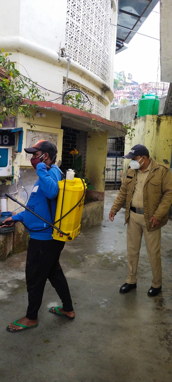 अल्मोड़ा-पंकज भट्ट वरिष्ठ पुलिस अधीक्षक अल्मोड़ा द्वारा पुलिस कर्मियों/जनता को कोरोना वायरस महामारी से बचाव हेतु कार्यालयों,परिसरों में दवाइयों का छिड़काव कर सैनेटाइज करने के निर्देश पर आज अरूण कुमार प्रभारी निरीक्षक कोतवाली अल्मोड़ा द्वारा चौकी धरानौला के सरकारी कार्यालय, में सैनेटाईजर का छिड़काव करवाया गया।