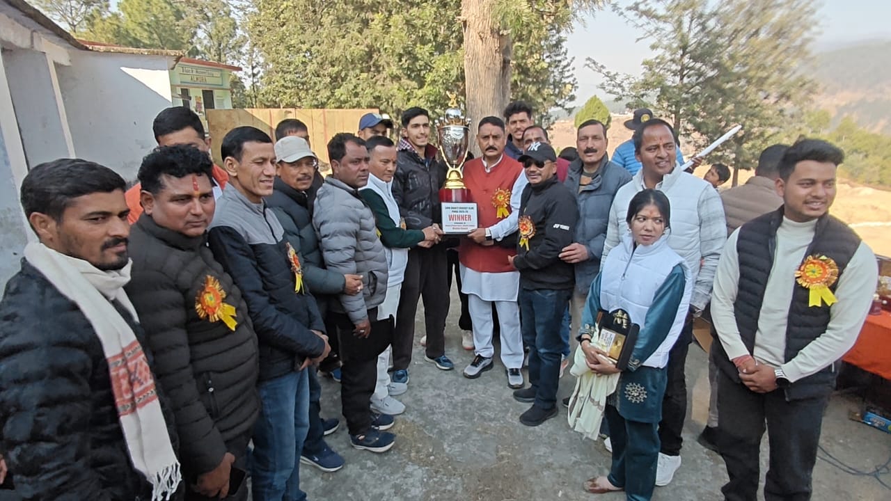 अल्मोड़ा-शिव शक्ति क्रिकेट टूर्नामेंट 2025-26 का दिनांक 18 जनवरी को फाइनल का महामुकाबला खेला गया कुल 32 टीमों ने इस टूर्नामेंट में प्रतिभाग किया जिसमें वी आई पी ब्वॉयज और रॉयल राजपूत फाइनल तक पहुंची।जिसमें रॉयल राजपूत ने पहले बल्लेबाजी कर 15 ओवर में 146 रन बनाए और वही वी आई पी ब्वॉयज ने 15 ओवर में 118 रन बनाए।जिस पर रॉयल राजपूत ने यह टूर्नामेंट जीत लिया।टूर्नामेंट में मुख्य अतिथि के रूप में पूर्व दर्जा मंत्री (केबिनेट स्तर) बिट्टू कर्नाटक उपस्थित रहे।उनके साथ पूर्व जिलाध्यक्ष रवि रौतेला,पूर्व जिला पंचायत सदस्य खत्याड़ी आनंद सिंह कनवाल,वर्तमान जिला पंचायत गोलना कडरिया प्रेम लटवाल,नगर अध्यक्ष भाजपा विनीत बिष्ट,छात्र संघ के कोषाध्यक्ष विनय कनवाल,पूर्व प्रधान व वर्तमान में किसान मोर्चा प्रदेश अध्यक्ष हरीश कनवाल,बी एस मनकोटी,ग्राम प्रधान खत्याड़ी देव सिंह कनवाल,पूर्व प्रधान तलाड विनोद कनवाल,पूर्व प्रधान सेनार अर्जुन बिष्ट,राजकीय ठेकेदार राजेंद्र सिंह कनवाल,पूर्व सैनिक रमेश जोशी एवं देवेन्द्र कर्नाटक ,कमलेश कर्नाटक, दिनेश कुमार, अभिषेक तिवारी,प्रकाश मेहता सहित अन्य लोग मौजूद रहे। अपने संबोधन में बिट्टू कर्नाटक ने कहा कि युवा अपने दैनिक जीवन में खेलों को अपनाकर सकारात्मकता की ओर बढ़ सकते हैं।उन्होंने कहा कि जहां एक और खेल युवाओं को मानसिक एवं शारीरिक रूप से तंदुरुस्त रखने हैं वही नशे रूपी दलदल में जाने से भी रोकते हैं। उन्होंने कहा कि उनके द्वारा लंबे समय से युवाओं को खेलों से जोड़ने का कार्य किया जा रहा है। श्री कर्नाटक ने युवाओं से अपील की कि विपरीत परिस्थितियों के कारण भी जो युवा खेलों में रुचि रखते हैं पर संसाधनों के अभाव में खेलों से दूर हो रहे हैं वह उनसे संपर्क कर सकते हैं एवं उनके द्वारा खिलाड़ियों को क्रिकेट,वालीबाल एवं फुटबॉल आदि किट वितरित किये जाएंगे। उन्होंने कहा कि पिछले 10 वर्षों से उनका यह अभियान जारी है जो अनवरत रूप से जारी रहेगा।