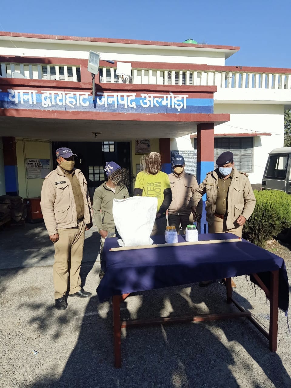 अल्मोड़ा-दिनांक 27.02.2022 को वादी गिरधर सिंह द्वारा पुत्र हीरा सिंह निवासी ग्राम असगोली द्वारा दिनांक 26/27.02.2022 की रात्रि में अज्ञात व्यक्ति द्वारा रानीखेत रोड के पास विजय काँटे का ताला तोड़कर दुकान से 2000 रु के नोट व सिक्के एवं दो इलैक्ट्रानिक तराजू चोरी कर लेने के सम्बन्ध में थाना द्वाराहाट में शिकायत दर्ज करायी गयी थी।तहरीर के आधार पर प्रभारी थानाध्यक्ष द्वाराहाट संतोष देवरानी द्वारा त्वरित कार्यवाही करते हुए थाना द्वाराहाट में मु०अ०सं० 04/2022 धारा 380/457 भादवि बनाम अज्ञात अभियोग पंजीकृत कर पुलिस टीम गठित कर जांच प्रारम्भ की गयी।पुलिस टीम द्वारा कड़ी सुरागरसी पतारसी तथा सीसीटीवी फुटेज के आधार पर संदिग्ध हुलिया प्रकाश में आने पर दिनांक 28.02.2022 को मुखबिर की सूचना पर विद्यापुर थाना द्वाराहाट क्षेत्र से अभियुक्तों को गिरफ्तार कर अभियुक्त के कब्जे से चोरी किया हुआ शत प्रतिशत एवं ताला तोड़ने में प्रयुक्त सम्बल बरामद कर आवश्यक कार्यवाही की गयी।अभियुक्तों की पहचान विष्णु प्रसाद शर्मा उम्र करीब 28 वर्ष पुत्र जयप्रकाश शर्मा निवासी ग्राम श्रीनौगार पो० व थाना ज्यूला जनपद उमला कडाली प्रदेश नेपाल,विराज शाही उम्र करीब 22 वर्ष पुत्र गोपाल शाही निवासी ग्राम फोटू थाना सोरू जनपद मूंग कडाली प्रदेश नेपाल के रुप में हुई है।पुलिस टीम में प्रभारी थानाध्यक्ष द्वाराहाट संतोष देवरानी, का० मौ० शाहिद,का०दिनेश कुमार,का०चरण सिंह,चालक केशव दत्त काण्डपाल शामिल रहे।