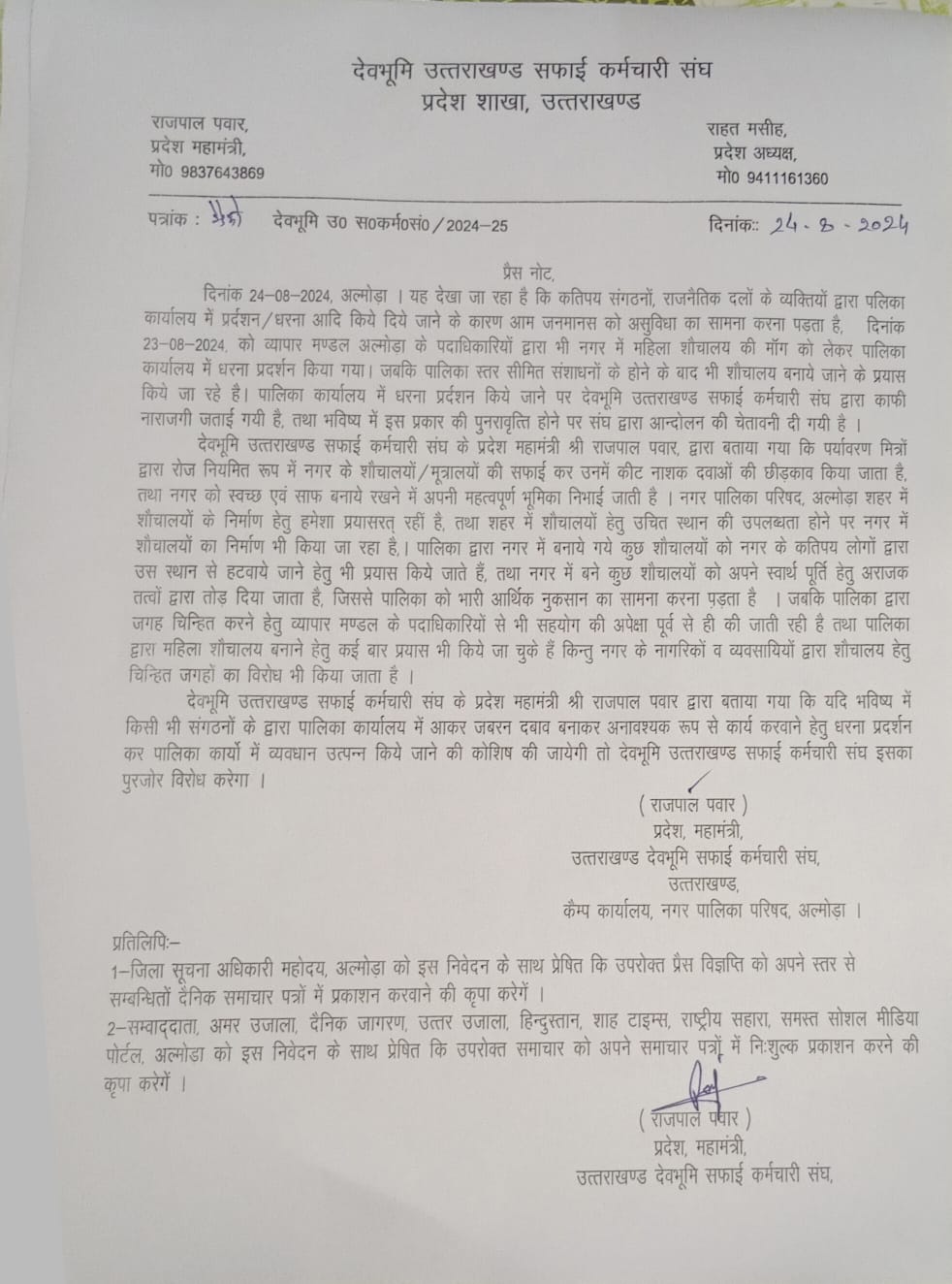 अल्मोडा-प्रेस को जारी एक बयान में देवभूमि उत्तराखण्ड सफाई कर्मचारी संघ के प्रदेश महामंत्री राजपाल पवार ने कहा कि यह देखा जा रहा है कि कतिपय संगठनों,राजनैतिक दलों के व्यक्तियों द्वारा पलिका कार्यालय में प्रदर्शन/धरना आदि किये जाने के कारण आम जनमानस को असुविधा का सामना करना पड़ता है।दिनांक 23-08-2024 को व्यापार मण्डल अल्मोड़ा के पदाधिकारियों द्वारा भी नगर में महिला शौचालय की माँग को लेकर पालिका कार्यालय में धरना प्रदर्शन किया गया। जबकि पालिका स्तर से सीमित संशाधनों के होने के बाद भी शौचालय बनाये जाने के प्रयास किये जा रहे है।पालिका कार्यालय में धरना प्रदर्शन किये जाने पर देवभूमि उत्तराखण्ड सफाई कर्मचारी संघ द्वारा काफी नाराजगी जताई गयी है तथा भविष्य में इस प्रकार की पुनरावृत्ति होने पर संघ द्वारा आन्दोलन की चेतावनी दी गयी है। देवभूमि उत्तराखण्ड सफाई कर्मचारी संघ के प्रदेश महामंत्री राजपाल पवार द्वारा बताया गया कि पर्यावरण मित्रों द्वारा रोज नियमित रूप में नगर के शौचालयों/मूत्रालयों की सफाई कर उनमें कीट नाशक दवाओं का छिड़काव किया जाता है तथा नगर को स्वच्छ एवं साफ बनाये रखने में अपनी महत्वपूर्ण भूमिका निभाई जाती है। नगर पालिका परिषद अल्मोड़ा शहर में शौचालयों के निर्माण हेतु हमेशा प्रयासरत रहीं है तथा शहर में शौचालयों हेतु उचित स्थान की उपलब्धता होने पर नगर में शौचालयों का निर्माण भी किया जा रहा है।पालिका द्वारा नगर में बनाये गये कुछ शौचालयों को नगर के कतिपय लोगों द्वारा उस स्थान से हटवाये जाने हेतु भी प्रयास किये जाते हैं तथा नगर में बने कुछ शौचालयों को अपने स्वार्थ पूर्ति हेतु तत्वों द्वारा तोड़ दिया जाता है जिससे पालिका को भारी आर्थिक नुकसान का सामना करना पड़ता है। जबकि पालिका द्वारा जगह चिन्हित करने हेतु व्यापार मण्डल के पदाधिकारियों से भी सहयोग की अपेक्षा पूर्व से ही की जाती रही है तथा पालिका द्वारा महिला शौचालय बनाने हेतु कई बार प्रयास भी किये जा चुके हैं।किन्तु नगर के नागरिकों व व्यवसायियों द्वारा शौचालय हेतु चिन्हित जगहों का विरोध भी किया जाता है।देवभूमि उत्तराखण्ड सफाई कर्मचारी संघ के प्रदेश महामंत्री राजपाल पवार द्वारा बताया गया कि यदि भविष्य में किसी भी संगठन के द्वारा पालिका कार्यालय में आकर जबरन दबाव बनाकर अनावश्यक रूप से कार्य करवाने हेतु धरना प्रदर्शन कर पालिका कार्यों में व्यवधान उत्पन्न किये जाने की कोशिश की जायेगी तो देवभूमि उत्तराखण्ड सफाई कर्मचारी संघ इसका पुरजोर विरोध करेगा।