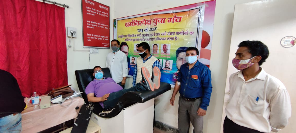 अल्मोड़ा-धर्मनिरपेक्ष युवा मंच के संयोजक विनय किरौला द्वारा कुछ दिन पूर्व एक अपील जारी कर कोरोनाकाल में अस्पतालों में हो रही रक्त की कमी को देखते हुए युवा साथियों और मंच के कार्यकर्ताओं से अधिक से अधिक मात्रा में स्वेच्छा से रक्तदान करने को कहा गया।उनकी इस अपील पर आज दिनांक 28 मई 2021 को जिला चिकित्सालय अल्मोड़ा के ब्लड बैंक में युवाओं ने बढ़ चढ़कर शिविर में भाग लिया।मंच संयोजक ने बताया कि डब्ल्यूएचओ की गाइड लाइन के अनुसार कोरोना की वैक्सीन लगने के कुछ समय तक रक्तदान नहीं किया जा सकता इसीलिए युवा साथियों से अपील की जा रही है कि वह अधिक से अधिक मात्रा में वैक्सीन लगाने से पूर्व रक्तदान अवश्य करें जिससे किसी जरूरतमंद का जीवन बच सके और रक्त के अभाव में कोई अपनी जिंदगी बचा सके।मंच संयोजक विनय किरौला ने जनता से आह्वान किया कि आकस्मिक परिस्थितियों में रक्त की जरूरत पड़ने पर धर्म निरपेक्ष युवा मंच से संपर्क कर सकते हैं।इस अवसर पर जिला चिकित्सालय अल्मोड़ा के मुख्य चिकित्सा अधीक्षक आरसी पंत,ब्लड बैंक प्रभारी डां आर एस शाही,मनोज धानिक,प्रकाश नगरकोटी,राजेन्द्र लटवाल,मंच संयोजक विनय किरौला, मीडिया समन्वयक मयंक पंत,मनीष भाकुनी,उपप्रधान माट मोहन मेहरा,मुकेश कनौजिया,पवन मुस्यूनी,अमित चौधरी,सूरज टम्टा,सतीश कुमार,गिरीश तिवारी, भूपेश दसौनी,यश त्रिपाठी,मनोज लटवाल,हरीश लटवाल,दयाल बेलवाल,निरंजन पांडेय,तेज सिंह कनवाल,सुन्दर लटवाल,पंकज कुमार,राजेन्द्र लटवाल,राजन कनवाल,सुषमा आर्या ने प्रतिभाग किया।