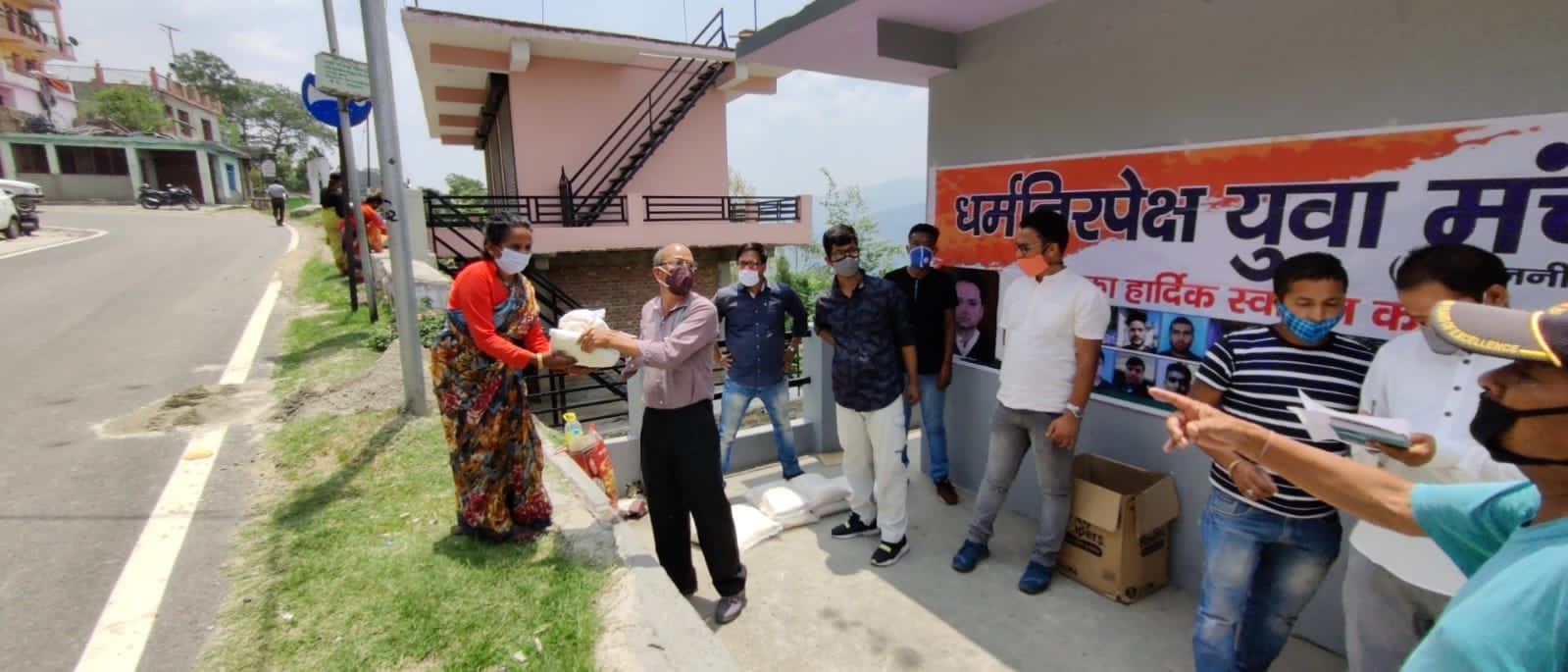 अल्मोड़ा-आज दिनांक 9 जून 2021 को धर्मनिरपेक्ष युवा मंच के द्वारा प्रत्येक जरुरतमंद के द्वार अन्न अभियान के तहत अल्मोड़ा शहर से लगे फलसीमा में अनेकों परिवारों को राशन वितरण किया गया।ब्लाक समन्वयक बिशन सिंह ने बताया कि मंच द्वारा इस कोरोनाकाल में लगातार राशन कार्ड विहिन लोग तथा जिनका राशन कार्ड आनलाईन ना होने से राशन नहीं मिल पा रहा है और रोजगार विहिन अत्यंत जरुरतमंद अनेकों परिवार को मंच संयोजक विनय किरौला के आह्वान पर अनेकों स्थानों पर राशन वितरण किया जा रहा है।जिस क्रम में आज उनकी ग्राम सभा फलसीमा में राशन वितरण किया जा रहा है।मंच संयोजक विनय किरौला ने बताया कि कि जब तक परिस्थितियां सामान्य नहीं हो जाती है तब तक मंच द्वारा लगातार जरूरतमंदों की मदद करने का अभियान जारी रहेगा।इस अवसर पर मंच संयोजक विनय किरौला, मीडिया समन्वयक मयंक पंत,मनीष भाकुनी, ब्लाक समन्वयक बिशन सिंह,गिरीश तिवारी,त्रिभुवन बिष्ट,के एन जोशी, मनोज बिष्ट,संजय बिष्ट,क्षेत्र पंचायत सदस्य महिमा बिष्ट,भुवन बिष्ट,त्रिलोक बिष्ट,लक्मन बिष्ट,भूपाल बिष्ट,धन सिंह बिष्ट,इत्यादि लोग मौजूद रहे।