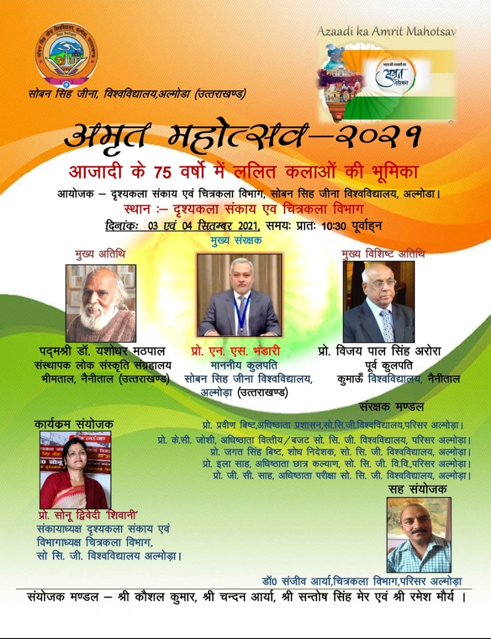 अल्मोड़ा-सोबन सिंह जीना विश्वविद्यालय अल्मोडा में अमृत महोत्सव 2021 के अन्तर्गत दृश्यकला संकाय एवं चित्रकला विभाग द्वारा प्रो० एन०एस०भंडारी कुलपति सोबन सिंह जीना विश्वविद्यालय, अल्मोड़ा के संरक्षण एवं मार्ग दर्शन मे आनलाईन दो दिवसीय राष्ट्रीय परिचर्चा (वेबिनार) का आयोजन किया जा रहा है।कार्यक्रम संयोजक प्रो०सोनू द्विवेदी शिवानी दृश्यकला संकायाध्यक्ष एवं चित्रकला विभागाध्यक्ष ने बताया कि इसमे प्रतिभाग करने के लिऐ देश के विभिन्न राज्यो से लोग जुड़े रहे है। आमंत्रित अतिथि वक्ताओं सहित प्रतिभागियों ने प्रस्तावित विषय पर अपने विचार भी लिपिबध्द कर शोध पत्र के रूप में प्रेषित किया है जिसका ई स्मारिका के रूप मे प्रकाशन किया जायेगा।उक्त वेबिनार के उद्घाटन सत्र दिनांक 3 सितंबर 2021 मे मुख्य संरक्षक कुलपति सोबन सिंह जीना विश्वविद्यालय अल्मोड़ा अतिथियों का स्वागत करेंगे।मुख्य अतिथि के रूप मे पद्म श्री डा० यशोधर मठपाल संस्थापक लोकसंस्कृति संग्रहालय गीताधाम भीमताल,विशिष्ट अतिथि प्रो०वी०पी०एस०अरोरा पूर्व कुलपति कुमाऊं विश्वविद्यालय नैनीताल होंगे।