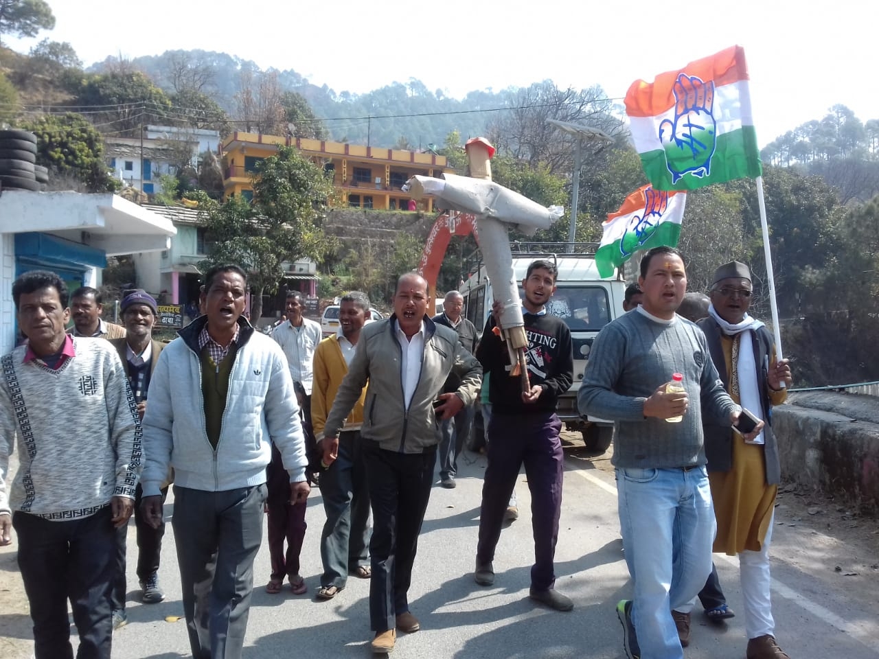 द्वाराहाट-ब्लाक कांंग्रेस कमेटी द्वाराहाट द्वितीय के कांंग्रेस पदाधिकारियों एवं कार्यकर्ताओं ने ब्लाक अध्यक्ष राजेन्द्र बिष्ट के नेतृत्व में कुंवाली पुल पर बेतहाशा बढ़ रही महंगाई के विरोध में केन्द्र सरकार का पुतला दहन किया।इस अवसर पर ब्लाक अध्यक्ष राजेन्द्र बिष्ट ने कहा कि वर्तमान में पेट्रोल,डीजल,घरेलू गैस सिलेन्डर सहित दैनिक उपभोग की वस्तुओं के दाम आसमान छू रहे हैं।ऐसे में मध्यमवर्गीय और गरीब वर्ग को अपने परिवार के पालन पोषण में भारी दिक्कतों का सामना करना पड़ रहा है।इस अवसर पर कांंग्रेसजनों ने गहरा आक्रोश व्यक्त करते हुए कहा कि अच्छे दिनों का सपना दिखाकर सत्ता में आई भाजपा सरकार में ना तो युवाओं के लिए रोजगार है और ना ही ये सरकार महंगाई को नियंत्रित कर पा रही है।पुतला दहन कार्यक्रम में ब्लाक अध्यक्ष राजेन्द्र सिंह बिष्ट, जगदीश लाल वर्मा,पूरन सिंह बिष्ट, सुन्दर लाल वर्मा,शिव सिंह बजेठा,मदन लाल,इन्द्र लाल,दयाल बोरा,माथुर राम,मदन राम,बची राम,विनोद कुमार,दीवान राम,बहादुर राम,योगेश सिंह,जगदीश सिंह बजेठा,न्याय पंचायत अध्यक्ष राजेन्द्र सिंह बिष्ट,पूरन राम,जगदीश सिंह,मनोज बिष्ट, गिरीश राम,पन राम,पूरन राम,गणेश चन्द्र, हेम चन्द्र सहित दर्जनों कांंग्रेसजन शामिल रहे।