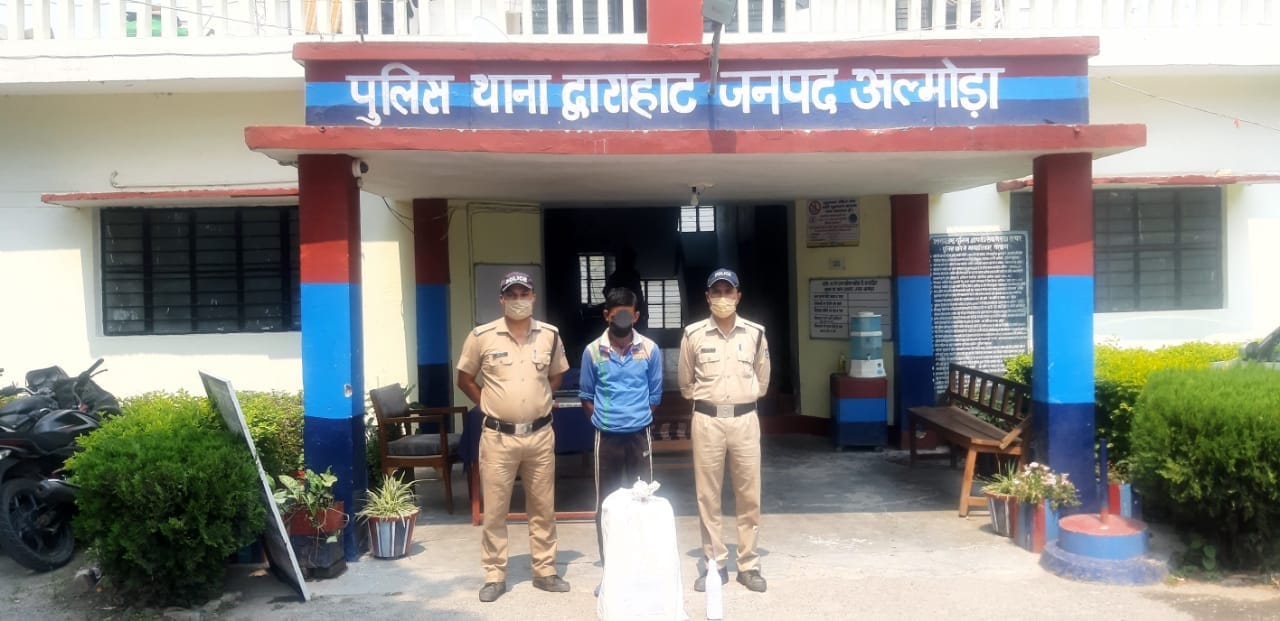 अल्मोड़ा-प्रदीप कुमार राय वरिष्ठ पुलिस अधीक्षक अल्मोड़ा द्वारा अवैध मादक पदार्थ तस्करी करने वालो के विरुद्ध कार्यवाही करने सख्त निर्देश पर दिनांक 7.05.2022 को थाना द्वाराहाट की पुलिस टीम उ० नि० निखिलेश बिष्ट प्रभारी चौकी बग्वाली पोखर,कानि० कुन्दन गिरी,कानि० सुन्दर सिंह द्वारा चैकिंग के दौरान बग्वालीपोखर से अल्मोड़ा को जाने वाली सड़क में ग्राम बासुलीसेरा मे खरेटी के पास एक व्यक्ति दीपक सिंह नेगी उम्र करीब 36 वर्ष पुत्र स्व०गंगा सिंह नेगी निवासी ग्राम व पोस्ट रतगल तहसील रानीखेत जनपद अल्मोड़ा के पास से 2 पेटी (24 बोतल) कीमत 10,000 रु० की अवैध देशी शराब बाजपुर मार्का बरामद की गई।उपरोक्त व्यक्ति को गिरफ्तार कर थाना द्वाराहाट में 60 आबकारी अधि० में अभियोग पंजीकृत कर आवश्यक कार्यवाही की जा रही है।