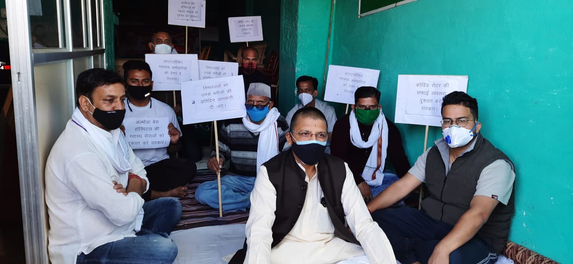 अल्मोड़ा-आज पूर्व संसदीय सचिव एवं अल्मोड़ा के पूर्व विधायक मनोज तिवारी ने बेस कोविड अस्पताल में स्वास्थ्य सुविधाएं बेहतर करने,आउटसोर्सिंग स्वास्थ्य कर्मियों को नियमित तनख्वाह देने,कोविड अस्पताल में आऊटसोर्सिंग या संविदा से स्टाफ/स्वास्थ्यकर्मियों की नियुक्ति करने की मांग को लेकर जिला कांंग्रेस कार्यालय में धरना दिया।इस अवसर पर पूर्व विधायक मनोज तिवारी ने कहा कि बेस कोविड अस्पताल में सफाई व्यवस्था दुरूस्त की जाए।कोविड अस्पताल होने के बाबजूद शौचालयों की स्थिति काफी बद्तर है।उन्होंने कहा कि इसके साथ ही कोविड अस्पताल में निरन्तर अपनी सेवाएं दे रहे स्वास्थ्य कर्मियों को वेतन का भुगतान नहीं किया जा रहा है।इन संविदा कर्मियों एवं आउटसोर्सिंग कर्मियों को अविलम्ब वेतन का भुगतान किया जाए।श्री तिवारी ने कहा कि मेडिकल स्टाफ की कमी से कोविड अस्पतालों में मरीजों को काफी दिक्कतों का सामना करना पड़ रहा है इसलिए अविलम्ब आऊटसोर्सिंग या संविदा पर बेस कोविड अस्पताल में कर्मियों की भर्ती की जाए।कोविड अस्पतालों में भर्ती मरीजों के तीमारदारों को उनके स्वास्थ्य की जानकारी नहीं मिल पा रही है जिस कारण काफी दिक्कतों का सामना करना पड़ रहा है।उन्होंने कहा कि कोविड अस्पताल में हेल्प डेस्क को सुविधाजनक बनाना चाहिए जिससे कि मरीज के तीमारदारों को मरीजों की जानकारी मिल सके।उन्होंने मांग की कि अल्मोड़ा जिले में न्याय पंचायत स्तर पर कोविड 19 टेस्ट की व्यवस्था की जाए तथा सभी ग्रामीणों का कोविड टेस्ट किया जाए।उन्होंने कहा कि टेस्ट होने से संक्रमण से ग्रस्त व्यक्तियों को तुरन्त उपचार मिल सके।श्री तिवारी ने कहा कि प्रत्येक न्याय पंचायत स्तर पर वैक्शीनेसन की व्यवस्था भी की जाए ताकि वैक्शीन लगने की प्रक्रिया को गति मिल सके।इसके साथ ही उन्होंने स्थानीय जनता से अपील भी की है कि सभी लोग सर्तकता बरतें तथा घरों पर ही रहें।श्री तिवारी ने मांग की है कि अल्मोड़ा बेस कोविड अस्पताल में अविलम्ब आई सी यू की स्थापना के साथ वेंटिलेटरों की व्यवस्था की जाए ताकि मरीजों को यथासमय ईलाज मिल सके।उन्होंने जनता से डबल मास्क लगाने की अपील भी की।धरने में पूर्व विधायक मनोज तिवारी,कांंग्रेस नगर अध्यक्ष पूरन रौतेला,वरिष्ठ उपाध्यक्ष तारा चन्द्र जोशी,दुग्ध संघ उपाध्यक्ष दीप सिंह डांगी,प्रदेश सेवादल के संजय दुर्गापाल,जिला उपाध्यक्ष पारितोष जोशी,जिला उपाध्यक्ष सचिन आर्या,यूथ प्रदेश प्रवक्ता वैभव पान्डेय,कांंग्रेस जिला प्रवक्ता राजीव कर्नाटक,कांंग्रेस जिला सचिव दीपांशु पाण्डेय,छात्रनेता विपुल कार्की उपस्थित रहे।धरने में सोशियल डिस्टेंसिंग का पूरी तरह पालन किया गया।