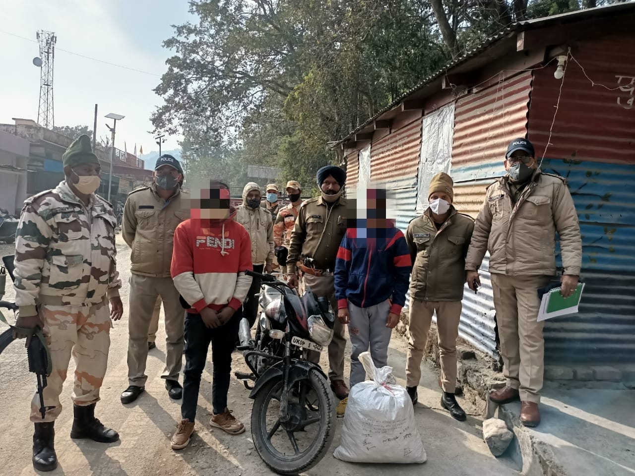 अल्मोड़ा-आगामी विधान सभा चुनाव को निष्पक्ष/सकुशल सम्पन्न कराने हेतु डॉ० मंजूनाथ टीसी वरिष्ठ पुलिस अधीक्षक अल्मोड़ा के निर्देश पर जनपद के प्रत्येक बैरियरों एवं थाना क्षेत्रों में चल रही सघन चैकिंग एवं युवाओं को नशे से बचाने हेतु चलाये जा रहे अभियान Youth Against Drugs के अन्तर्गत दिनांक 29.01.2022 को थानाध्यक्ष भतरौजखान/FST, SST टीम द्वारा दौराने चैकिग मोहान सहायता केन्द्र में वाहन संख्या UK06-S-0423 मो०सा० में सवार 2 व्यक्तियों के कब्जे से कुल 10.390 किलोग्राम गांजा बरामद कर दोनों को गिरफ्तार करते हुए थाना भतरौजखान में NDPS Act के अन्तर्गत अभियोग पंजीकृत कर आवश्यक कार्यवाही की जा रही है। नशा परिवहन में प्रयुक्त वाहन को सीज की कार्यवाही की गयी।थानाध्यक्ष भतरौजखान अनीश अहमद ने बताया कि दोनों व्यक्ति गांजा अधिक दामों में बेचने हेतु मुरादाबाद ले जा रहे थे, चैकिंग के दौरान गिरफ्त में आये है। विक्रेता एवं खरीददार की भूमिका की जांच की जा रही है।आगामी चुनाव को सकुशल एवं निष्पक्ष कराये जाने हेतु लगातार बैरियरों पर FST एवं SST एवं अर्द्धसैनिक बलों के साथ संयुक्त रूप से सघन चैकिंग अभियान लगातार जारी है।अभियुक्तों की पहचान मो० आरिफ उम्र 22 वर्ष पुत्र लईक निवासी ग्राम फौलादपुर,ठाकुरद्वारा जनपद मुरादाबाद उ०प्र०,मो० आरिफ उम्र- 23 वर्ष पुत्र महमूद हसन निवासी बिजलीघर के पीछे नई बस्ती वार्ड नं० 22,ठाकुरद्वारा जनपद मुरादाबाद उ०प्र० के रूप में हुई है।बरामदगी में कुल 10.390 किलोग्राम गांजा