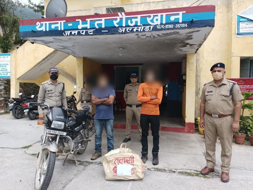 अल्मोड़ा-पंकज भट्ट वरिष्ठ पुलिस अधीक्षक अल्मोड़ा द्वारा सभी थाना चौकी प्रभारियों को अपने-अपने क्षेत्र में अवैध रूप से गाँजा/चरस व अन्य नशीली पदार्थो की तस्करी कर रहे तस्करों पर कार्यवाही करने के निर्देश पर दिनांक 15.07.2021 को देवेन्द्र सिंह सामन्त प्रभारी चौकी भिकियासैण ने दौराने चैकिंग चौकी तिराहा भिकियासैण से मो० सा० संख्या- UK 19 A 3606 स्प्लेंडर प्लस सवार प्रकाश चंद्र पुत्र (उम्र 38 वर्ष) राम लच्छी राम निवासी ग्राम गेबुआखास थाना कालाढूंगी जिला नैनीताल,मनीष आर्य (उम्र 28 वर्ष) पुत्र पूरन राम निवासी गेहुआडील थाना कालाढूंगी जिला नैनीताल के कब्जे से अवैध गांजा कुल 8.300 किलोग्राम कीमत ₹ 33200.00 परिवहन करते हुए बरामद करने पर थाना भतरौजखान में 23/21 धारा 8/20/60 एनडीपीएस एक्ट बनाम प्रकाश चंद्र आदि पंजीकृत कर आवश्यक कार्यवाही की गयी।उक्त संबंध में थानाध्यक्ष भतरौंजखान अनीष अहमद ने बताया कि उपरोक्त अभियुक्तगण प्राइवेट नौकरी करते हैं, तथा नागचुलाखाल से अपने नशा करने हेतु गांजा एकत्र कर ले जा रहे थे।जिन्हें गिरफ्तार कर मो० सा० उपरोक्त को सीज कर अग्रिम कार्यवाही की जा रही है।पुलिस टीम में उ० नि० देवेन्द्र सिंह सामन्त (प्रभारी चौकी भिकियासैण),आरक्षी नापु० मनोज रावत,आरक्षी नापु०कविंद्र सिंह,आरक्षी नापु० देवराज सिंह,आरक्षी नापु०सुरेश कोरंगा शामिल रहे।