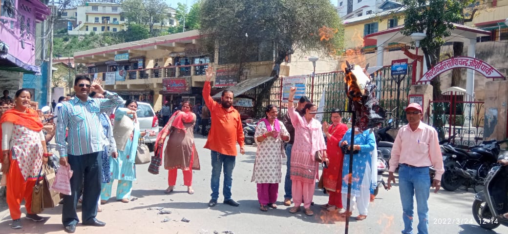 अल्मोड़ा-विगत दिनों घरेलू रसोई गैस के सिलेन्डर में पचास रूपये की भारी भरकम बढ़ोत्तरी से गुस्साए अल्मोड़ा के कांंग्रेसजनों ने आज स्थानीय चौघानपाटा में महिला कांंग्रेस जिलाध्यक्ष लता तिवारी के नेतृत्व में केन्द्र की मोदी सरकार का पुतला दहन किया।इस अवसर पर महिला कांंग्रेस जिलाध्यक्ष लता तिवारी ने कहा कि घरेलू गैस सिलेंडर के मूल्य में पचास रूपये की बढ़ोत्तरी करके मोदी सरकार ने जनता पर अतिरिक्त आर्थिक बोझ डालने का काम किया है।उन्होंने कहा कि जहां पहले से ही घरेलू गैस सिलेन्डर की कीमत 937 रूपये थी उसे और बढ़ाकर 987 रूपये कर दिया गया है।उन्होंने कहा कि पांच राज्यों में चुनाव के ठीक बाद घरेलू रसोई गैस के सिलेन्डर में मूल्य बढ़ोत्तरी करना सरकार की कथनी और करनी को स्पष्ट करता है।उन्होंने कहा कि जनता पहले से ही महंगाई की मार झेल रही है।इसपर दैनिक उपभोग की वस्तुओं को और अधिक महंगा करना जनता के ऊपर कुठाराघात है।कांंग्रेस नगर अध्यक्ष पूरन रौतेला ने कहा कि पेट्रोल,डीजल के मूल्य पहले से ही काफी बड़े हुए हैं जिस कारण खाद्यान्न,फल,सब्जी आदि के मूल्य भी आसमान पहुंच गये हैं।उन्होंने कहा कि जब तक पांच राज्यों में चुनाव थे तब तक ना तो रसोई गैस का मूल्य बढ़ा और ना ही पेट्रोल,डीजल के मूल्य बड़े।लेकिन चुनाव समाप्त होते ही रसोई गैस के मूल्य में पचास रूपये की भारी भरकम बढ़ोत्तरी कर भाजपा सरकार ने आम आदमी की रसोई का बजट बिगाड़ दिया है।उन्होंने कहा कि सरकार को जनता की भावनाओं की कद्र करनी चाहिए तथा महंगाई कम करने के लिए प्रयास करना चाहिए।उन्होंने कहा कि पेट्रोल और डीजल की कीमतों में भी दो दिन लगातार अस्सी पैसे की बढ़ोत्तरी कर दी गयी है।अगर इसी तरह पेट्रोल,डीजल और रसोई गैस की कीमतें बड़ती गयी तो मध्यमवर्गीय एवं गरीब वर्ग का जीना दुश्वार हो जाएगा।पुतला दहन कार्यक्रम में महिला कांंग्रेस जिलाध्यक्ष लता तिवारी,कांंग्रेस नगर अध्यक्ष पूरन सिंह रौतेला,कांंग्रेस जिला प्रवक्ता राजीव कर्नाटक,कांग्रेस जिला सचिव दीपांशु पाण्डे,कांंग्रेस प्रदेश सचिव राबिन भण्डारी,पप्पू बिष्ट,लीला जोशी,राधा बिष्ट,पूनम आर्या,माया गैड़ा,रजनी टम्टा,नारायण रौतेला,प्रत्येश पाण्डे,जया जोशी,आशा जोशी आदि शामिल रहे।