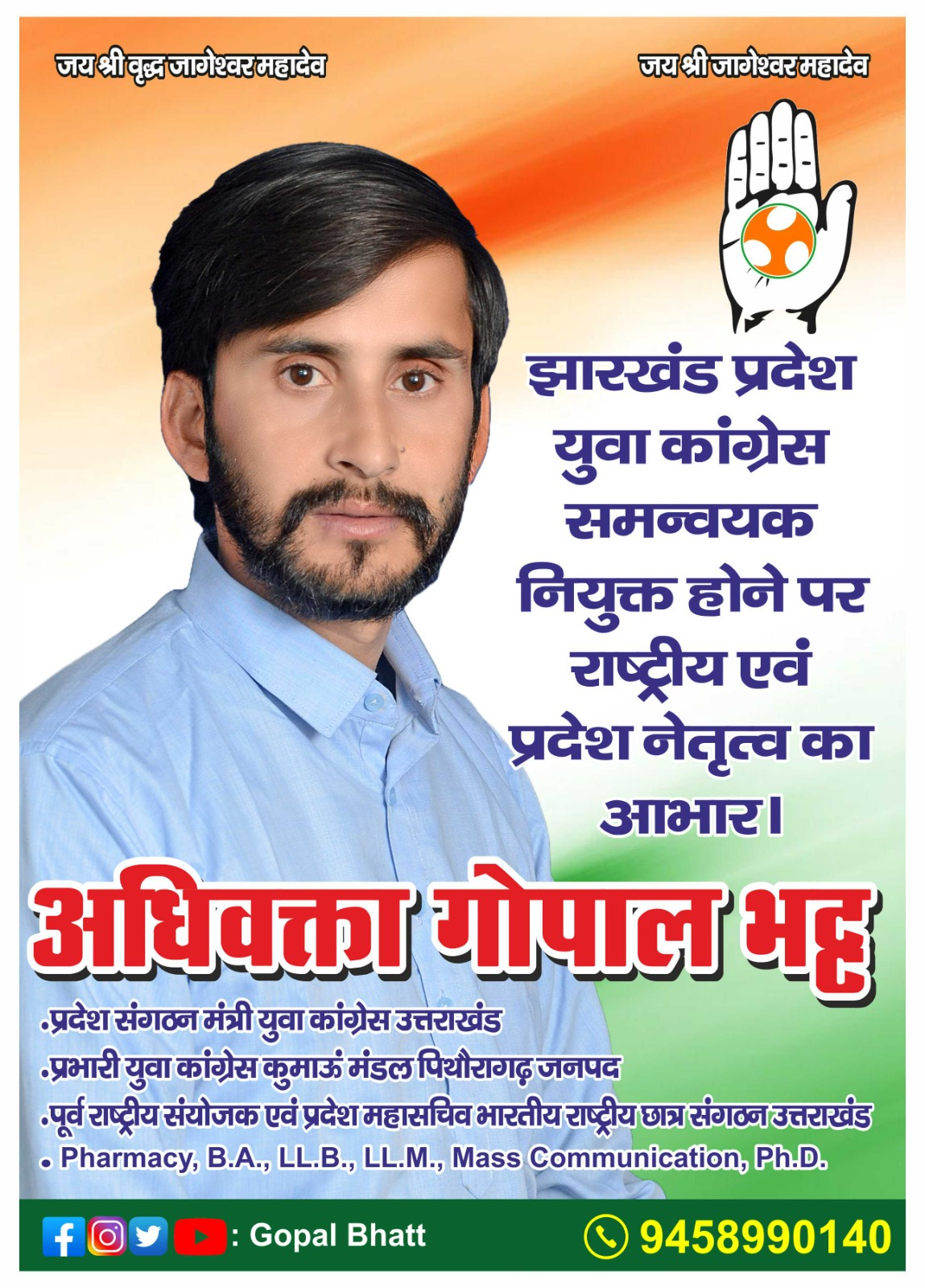 अल्मोड़ा-युवा नेता गोपाल भट्ट को युवा कांग्रेस राष्ट्रीय नेतृत्व द्वारा अनुभव एवं कार्य करने की शैली को देखते हुए यूथ कांग्रेस इलेक्शन प्रक्रिया के लिए झारखंड प्रदेश युवा कांग्रेस का समन्वयक नियुक्त किया गया है।गोपाल भट्ट इससे पहले विभिन्न एन एस यू आई तथा युवा कांग्रेस के दायित्वों में कार्य कर चुके हैं।गोपाल भट्ट ने कहा कि उनके द्वारा 21 जून से झारखंड भ्रमण करके सदस्यता गति देने के लिए कैंपेनिंग की जाएगी जिसमें युवाओं की राजनीति में अधिक से अधिक सक्रिय भूमिका तय करना और युवा कांग्रेस की सदस्या को बढ़ाना मुख्य उद्देश्य रहेगा।कहा कि चुनाव प्रक्रिया मेंबरशिप के माध्यम से प्रदेश,जिले, विधानसभाओ में युवाओं को आगे लाकर यूथ कांगेस के नेता के रूप में स्थापित करना तथा पार्टी विचारधारा को मजबूत करने का उनका मुख्य उद्देश्य हैं जिससे आम जनमानस की आवाज सड़क से लेकर विधानसभा तक उठाई जा सके।