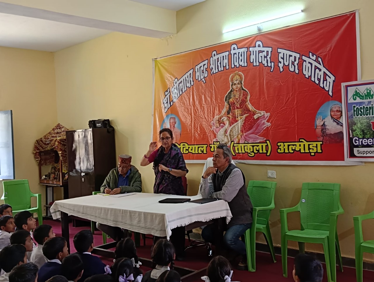 अल्मोड़ा-जागरूकता कार्यक्रमों के माध्यम से पर्यावरण चेतना को बढाने के लिए ग्रीन हिल्स ट्रस्ट द्वारा पर्यावरण की पाठशाला कार्यक्रम की शुरुआत करी गई है।इस कार्यक्रम का प्रारंभ ताकुला डोटियाल गाँव के श्रीराम विद्या मंदिर से किया गया। संस्था की सचिव डा वसुधा पन्त ने पर्यावरण के संरक्षण के लिए विद्यार्थियों को शिक्षा एवं विद्या में अंतर बताते हुए शिक्षा ग्रहण पर अपना ध्यान केन्द्रित करने को कहा। ग्लोबल वार्मिंग,जलवायु परिवर्तन के लिए मनुष्य के लालच को जिम्मेदार ठहराते हुए उन्होंने कहा की प्रकृति केवल मनुष्य के उपभोग के लिए नहीं है।इस पर हर प्रजाति का बराबर अधिकार है।अपने उपभोग पर नियंत्रण करके ही हम जलवायु परिवर्तन की विभीषिका से बच सकते हैं।हम आज जिस स्तिथि पर पहुँच चुके हैं किसी भी टेक्नोलॉजी से जलवायु परिवर्तन पर नियत्रण नहीं पाया जा सकता।बलबीर बोरा ने विद्यार्थियों को संबोधित करते हुए कहा कि हम अपनी प्रतिदिन की आदतों में सुधार करके प्रकृति को प्रदूषित होने से बचा सकते हैं।इसके लिए आवश्यक है की बच्चे प्लास्टिक पैकेज्ड खाद्यों जैसे चिप्स,कुरकुरे, टॉफी बिस्किट आदि का सेवन छोड़ कर ताजे फलों अथवा घर पर बने स्नेक्स का इस्तेमाल करें जो उनके स्वास्थ्य को भी दुरुस्त रखेगा और पर्यावरण को भी।ग्रीन हिल्स ट्रस्ट श्रीराम विद्या मंदिर का आभारी है।