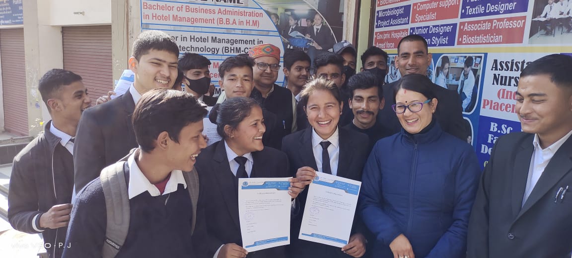 अल्मोड़ा-जय श्री कॉलेज अल्मोड़ा द्वारा होटल मैनेजमेंट के छात्र छात्राओं को ट्रेंनिंग के लिए ताज ग्रुप,अनन्ता उदयपुर,क्लार्क अवध लखनऊ की एन०ओ०सी० प्रदान की गई।कालेज के चेयरमेन भानु प्रकाश जोशी ने बताया कि जय श्री कॉलेज छात्र छात्राओं के भविष्य को सही दिशा देने के लिए उन्हें पांच सितारा होटल में ट्रेनिग और प्लेसमेंट प्रदान करता है। कालेज के चेयरमेन ने सभी छात्र छात्राओं को शुभकामनाएं प्रदान की और उनके उज्ज्वल भविष्य की कामना की।छात्र छात्राओं को जोइनिंग लेटर प्रदान करते वक्त कालेज के सीईओ प्रमोद कुमार जोशी,प्रधानाचार्य श्रीमती चंपा कनवाल,प्लेसमेंट ऑफिसर आशीष जोशी,पंकज चन्याल आदि लोग उपस्थित रहे।